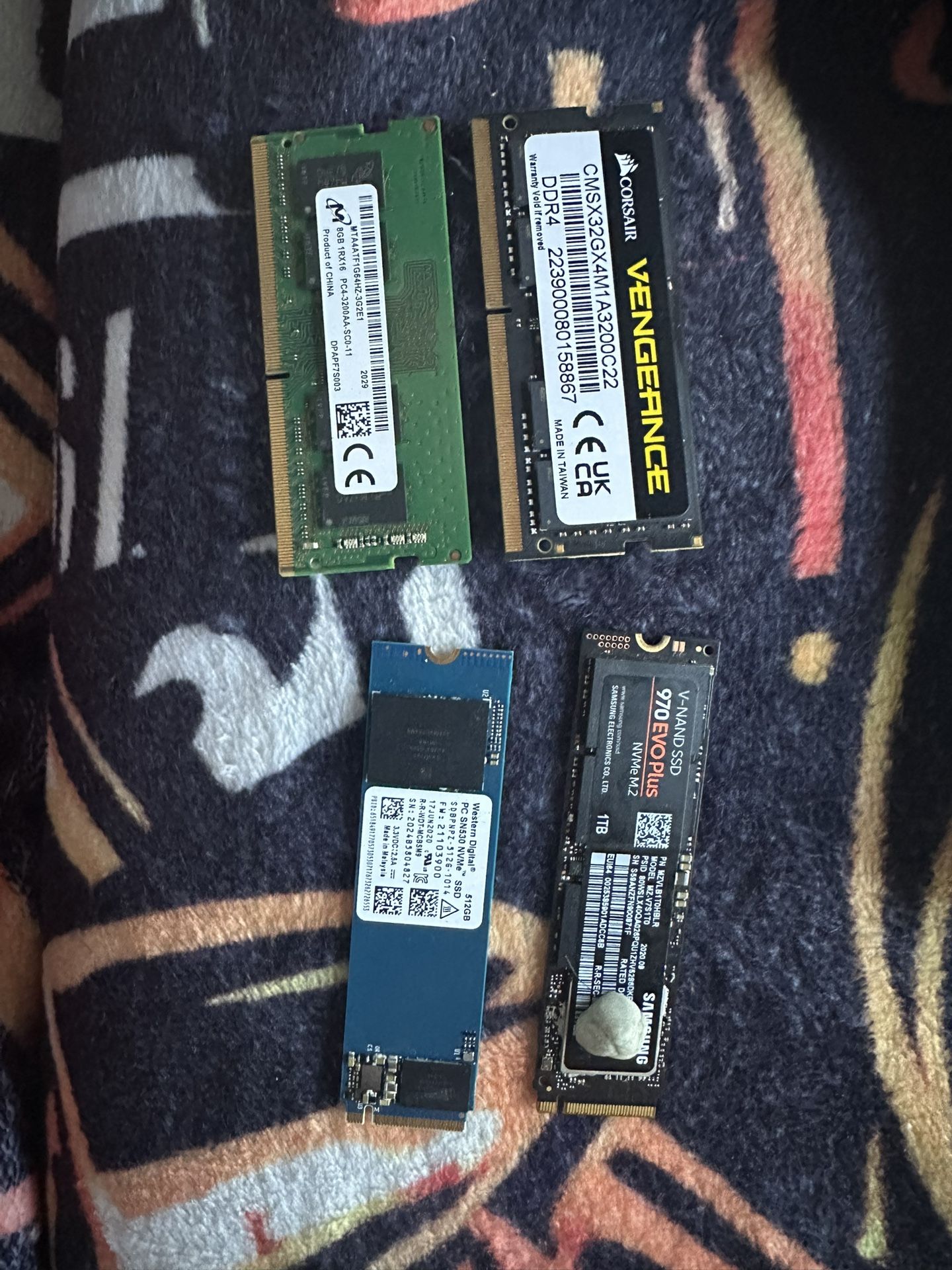 1 CORSAIR Vengeance 32GB DDR4 laptop RAM 1 micron 8GB DDR4 laptop ram 1 970 EVO Plus Samsung 1TB SSD 1 western digital 512GB SSD