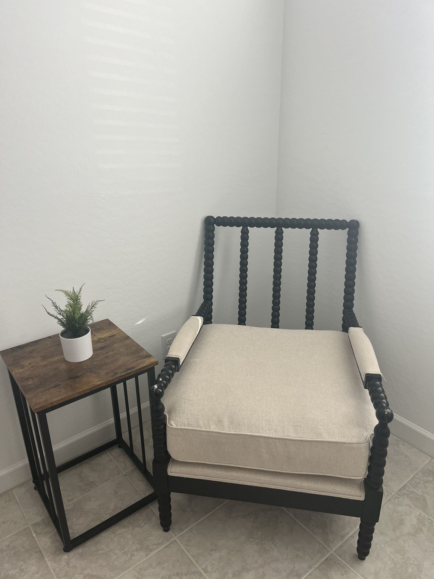 Spindle accent chair Does not have the back cushion. There is some scratching from moving and putting in different rooms. OBO / delivery for a fee