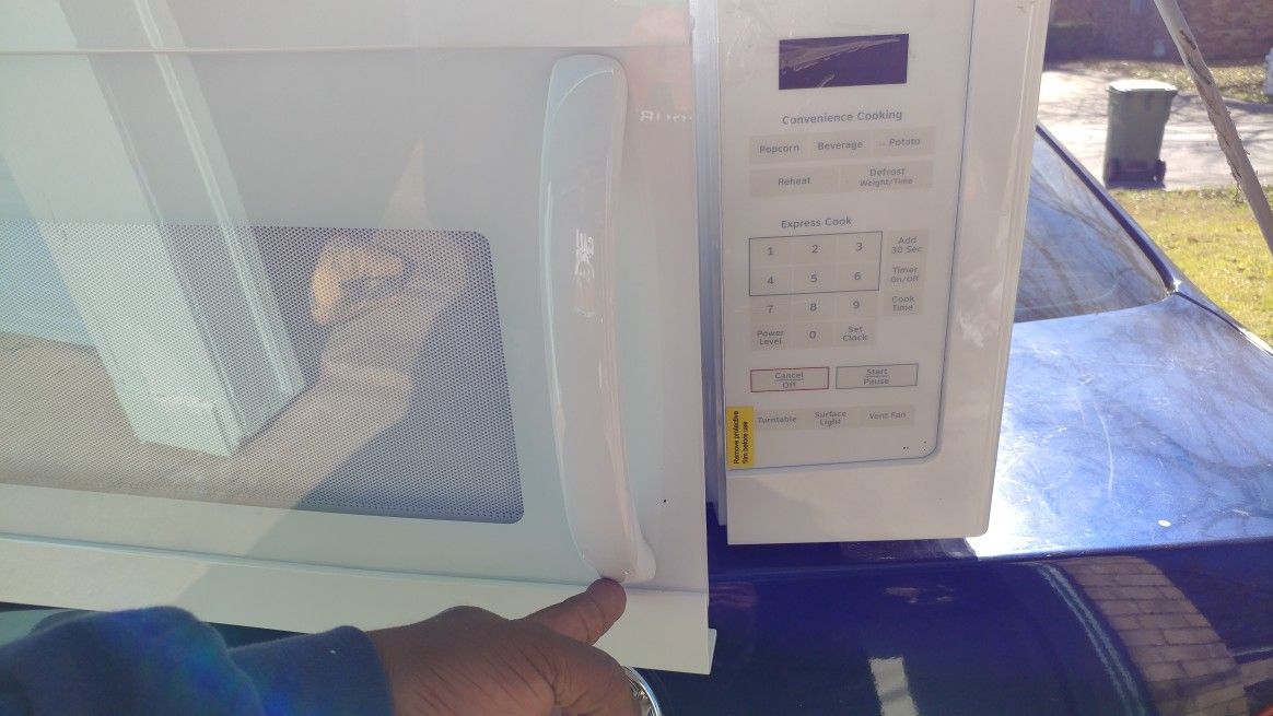 I have a brand new Hotpot above-the- stove microwave, unit fell off delivery truck see picture ,needs a glass plate inside , microwave works perfect slight scrape on wire , usually sold for $219 and higher . Asking price $85.