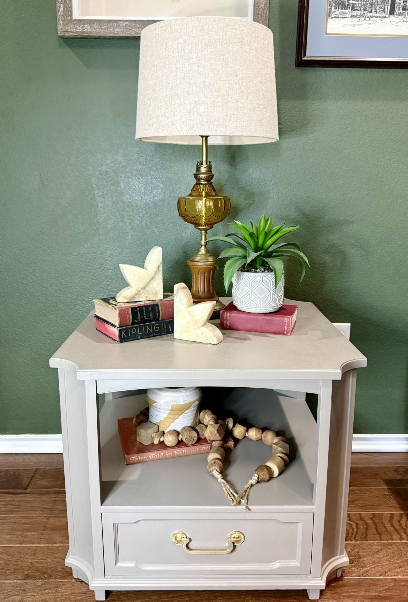 Refinished, mid-century modern. Drexel end table with drawer. Included new drawer lining and the original solid brass hardware. Finished in Gidden Premium - taupe paint with two coats of Minwax finishing wax. See photos for condition. Dimensions: 27 inches long 27 inches 22 1/2 inches tall Opening in between 10 1/2 inches tall 18 inches wide