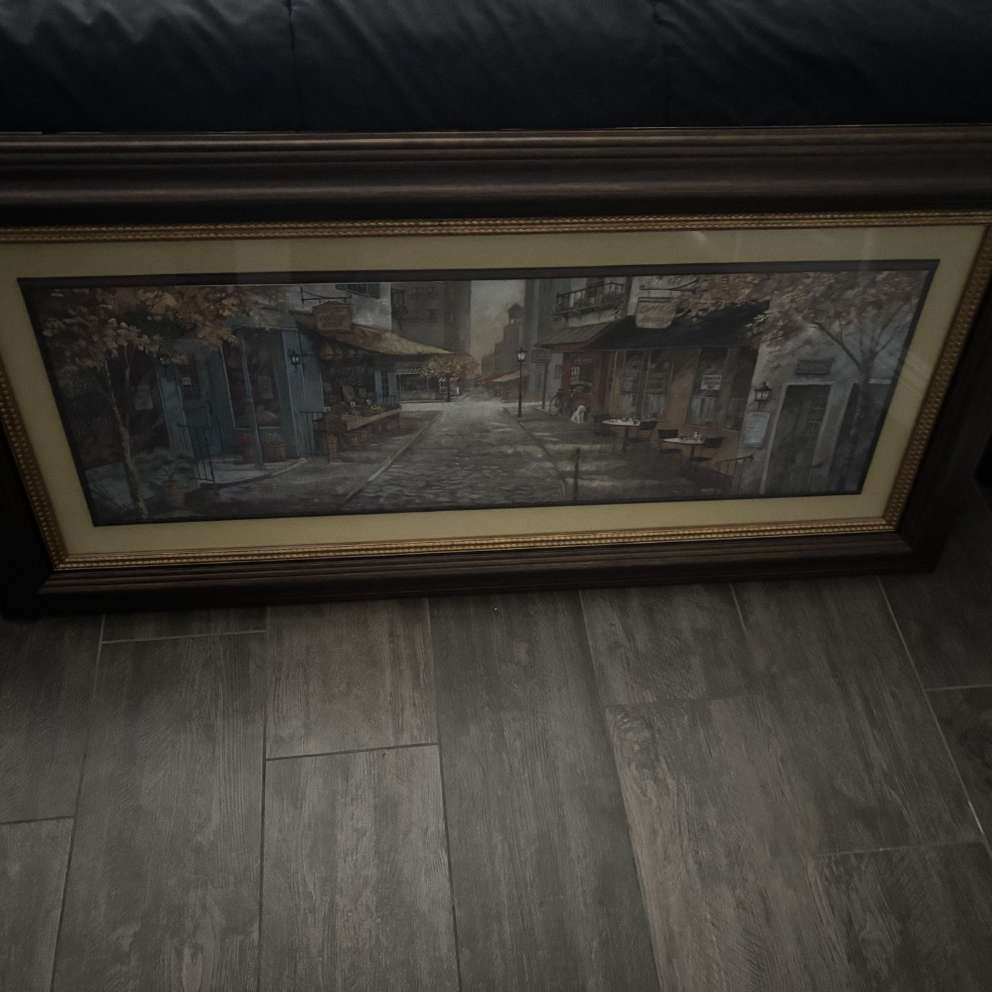 Beautiful oversized framed artwork featuring a charming European café street scene. Warm autumn tones, cobblestone street detail, and classic storefronts create a cozy, old-world atmosphere. The piece is professionally framed in an elegant, high-quality frame with a wide mat, making it a perfect statement piece for a living room, dining area, office, restaurant, or café.