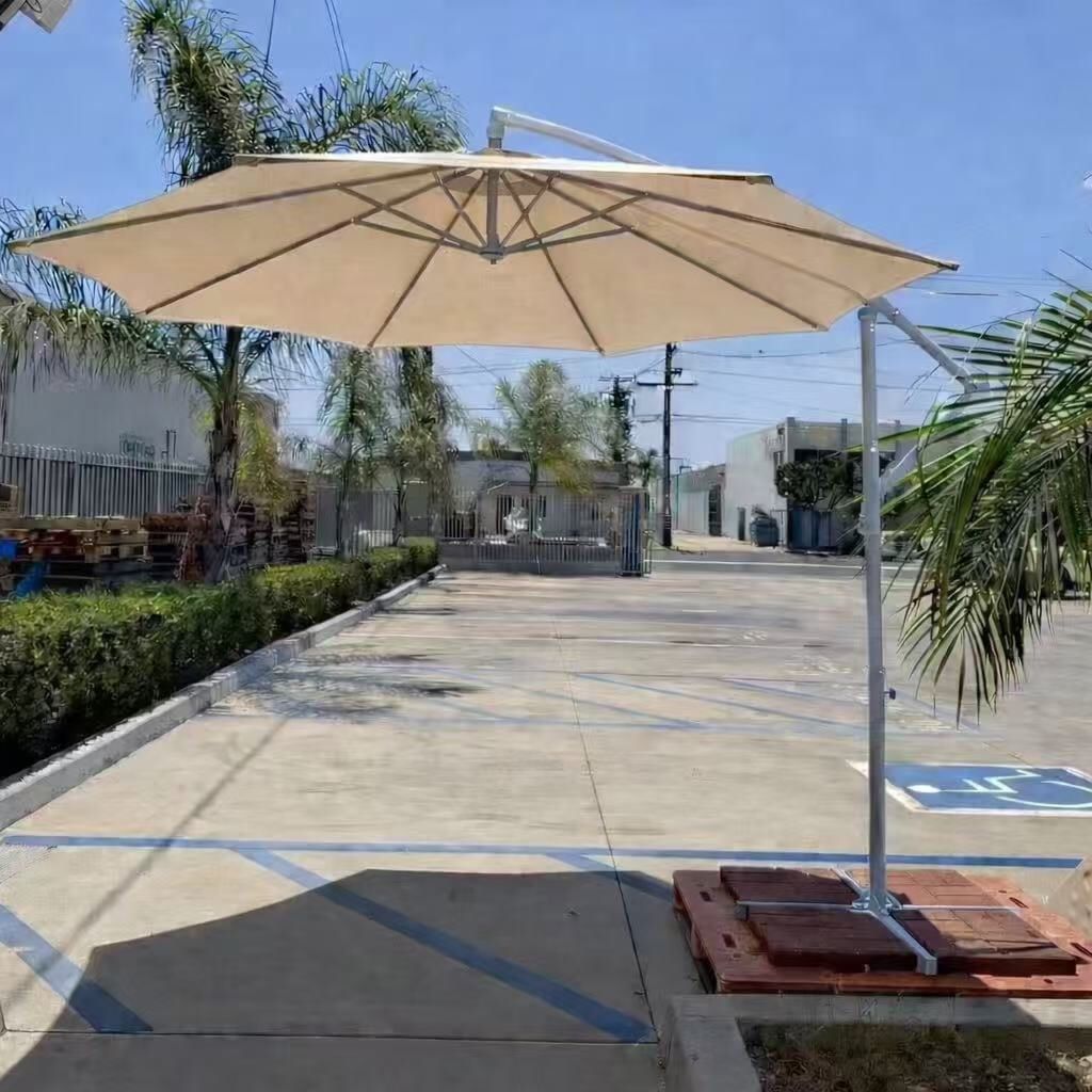 New In Box 10 Foot Diameter Outdoor Patio Offset Cantilever Deck Beige Umbrella With Cross Stand Require Counter Weight