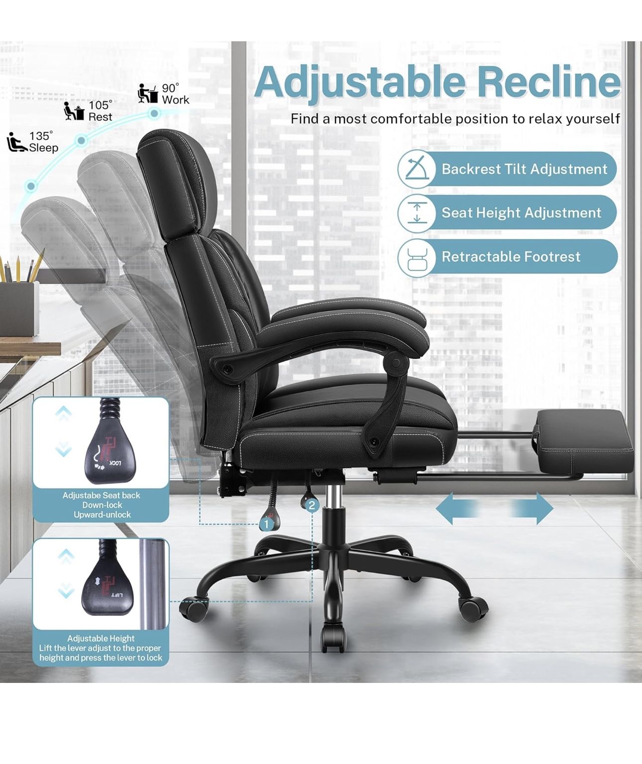 Executive Leather Office Chair, Big and Tall Office Chair with Footrest Home Office Desk Chairs, Ergonomic Computer Desk Chair with Lumbar Support, Re