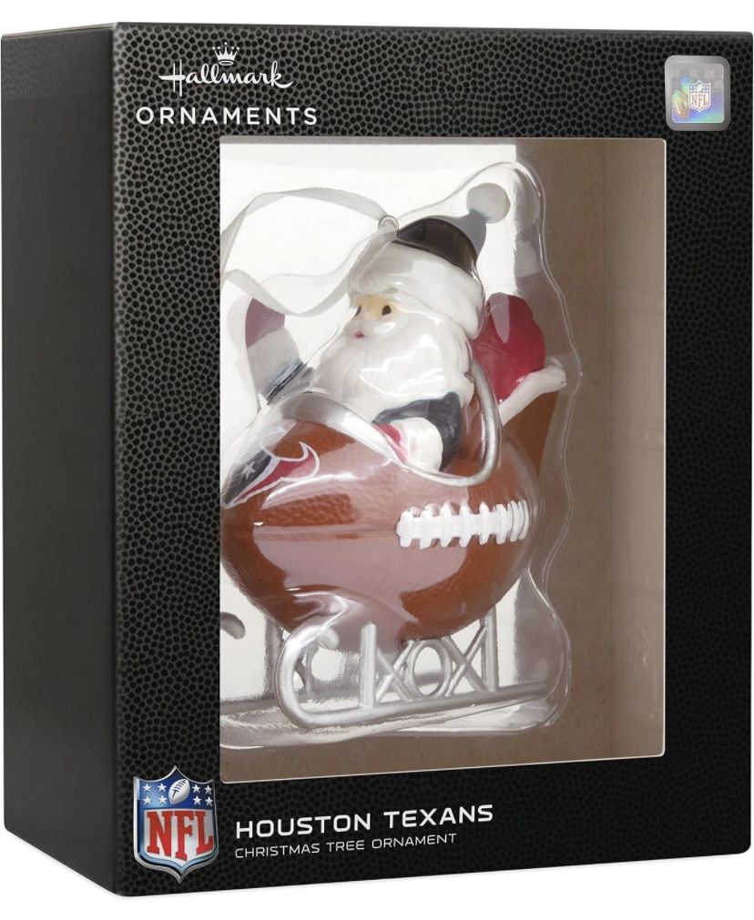 NEW Houston Texans Hallmark Ornament - Santa in Sleigh Box and packaging in excellent condition About this item Cheer on the Houston Texans with this festive Christmas tree ornament. Stylized design features Santa dressed in team colors and riding in a football-shaped sleigh decorated with the team logo. Made of resin, this Hallmark Ornament measures 2.1 x 3.54 x 2.91 inches. The ornament is ready to hang on your Christmas tree with a hanger attachment. Great Christmas gift idea for fans of the Houston Texans and NFL football. Hallmark Ornaments celebrate characters and personalities from contemporary and classic movies, TV shows, toys, entertainment and sports. Each festive and collectible ornament is perfect for sharing with family and friends.