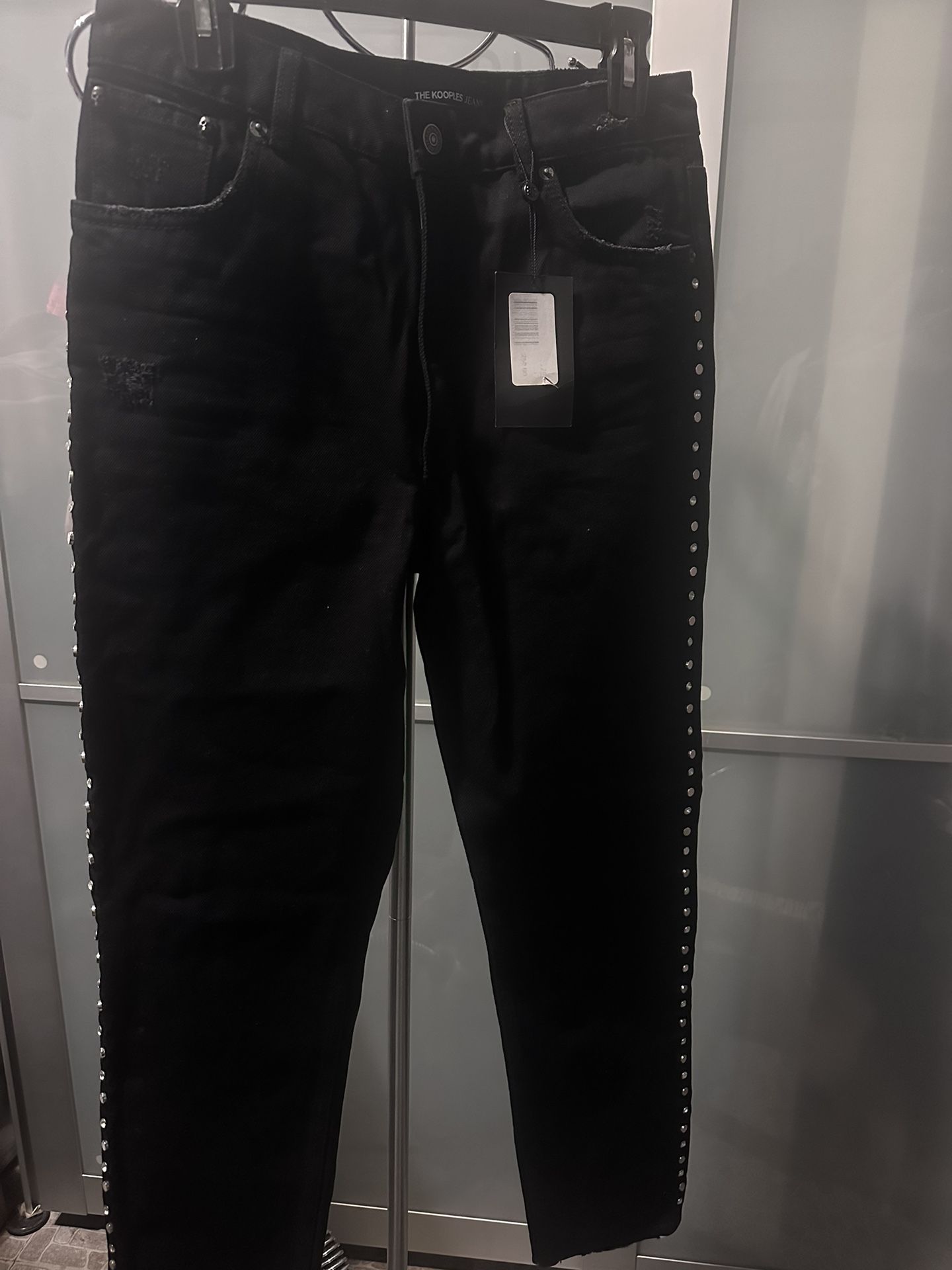 Black jeans with decorative silver-tone studs along both side seams. Classic five-pocket styling. Zipper fly with tag attached. Relaxed, high waist, ankle fit. Fits like a 26/27. Sleek, edgy look that pairs with boots or heels.