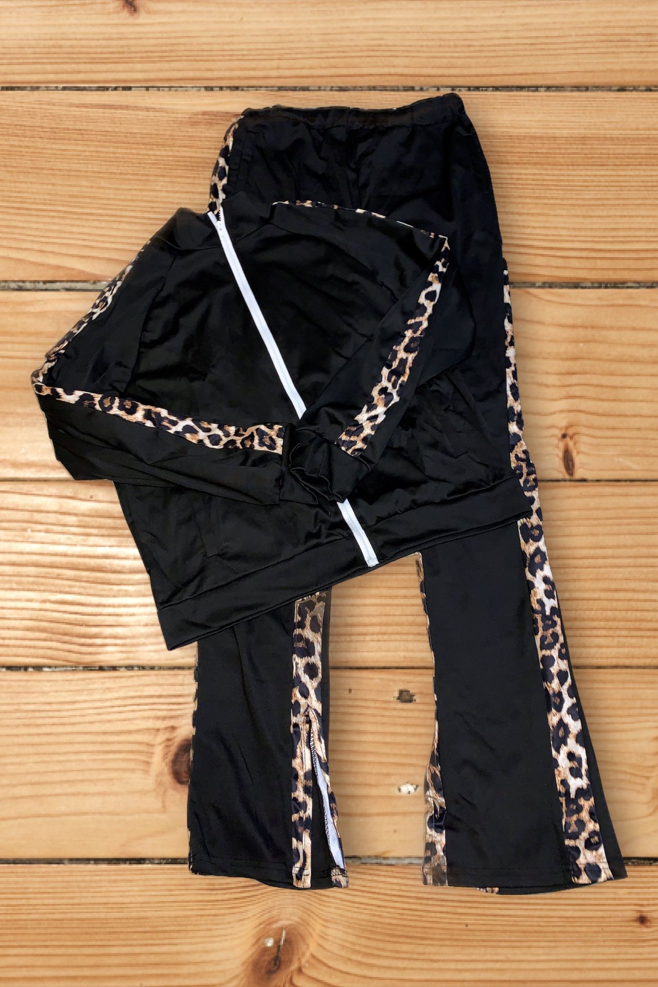 Women’s Black Sports Suit With Leopard Print Stripes Two-Piece