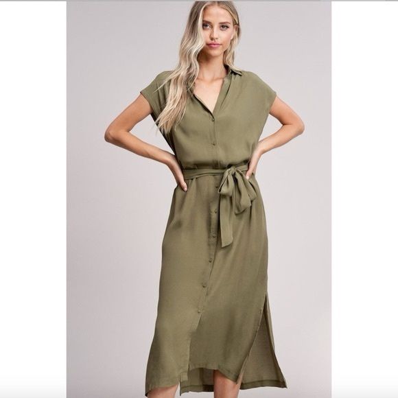 "Zara Women’s Size XS Midi dress Has slide slits Chic olive green dress featuring a matching belt. Perfect for versatile styling. Great for vacation! Has signs of wear and some pulling but it’s in overall good used condition."