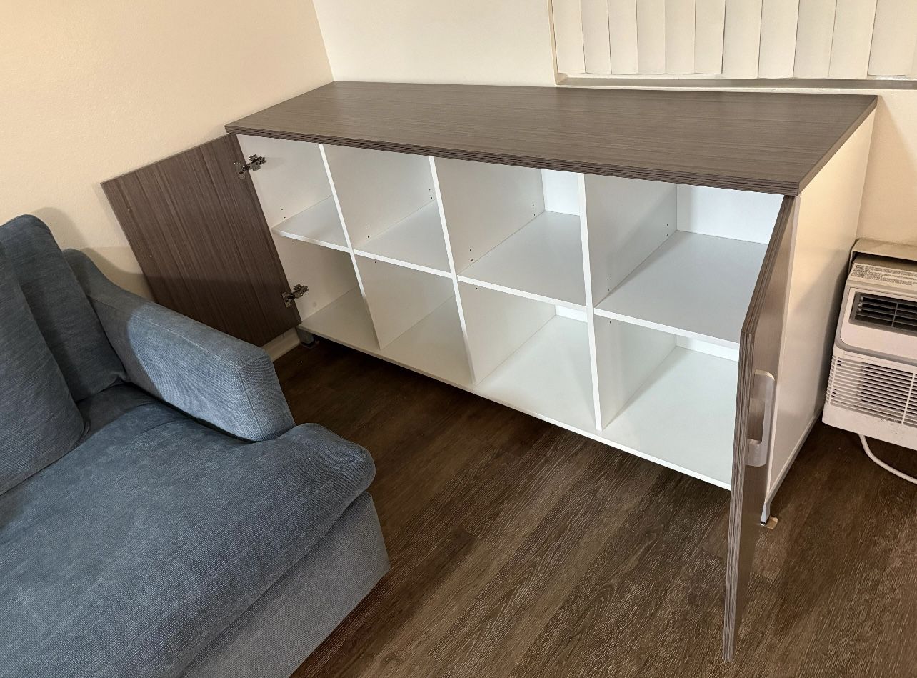 Modern storage cabinet in great condition. Features a sleek wood-look top with white interior shelves and two side doors. Very sturdy and spacious, perfect for living room storage, dining room, office, or entryway. No damage or major scratches. Ready for pickup. Cash only.
