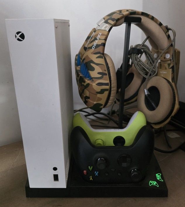Only used for a few months and has been sitting around collecting dust. Comes with two controllers , two headsets that plug into controllers and a home base charging station as well.