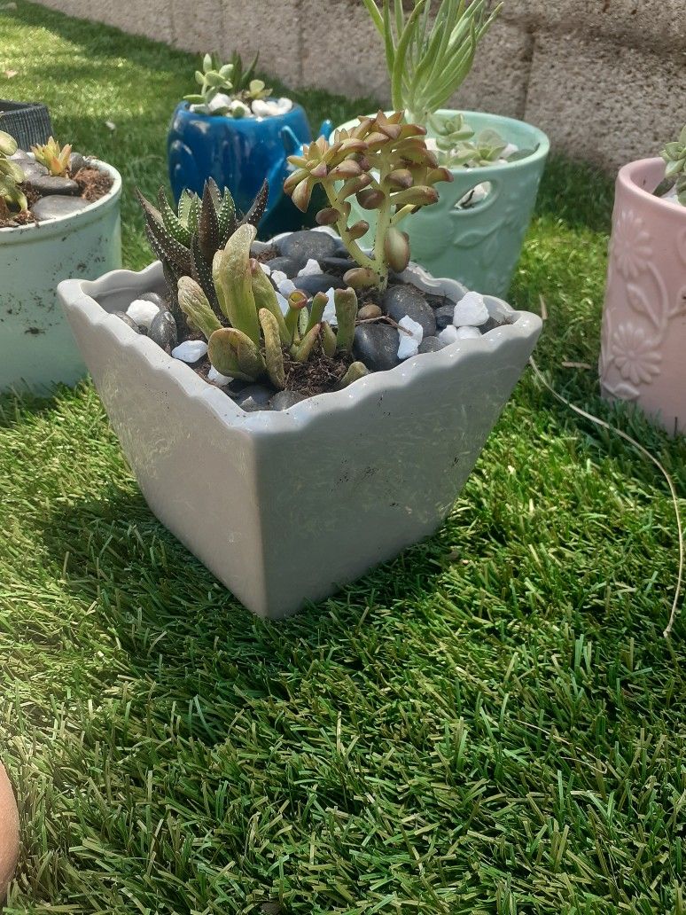 Purchase anytime of the year Have these and many more. Any occasion of succulents, put by her /his bedside her work area or in her garden. Prices are from $10 for pink and green pots Snail and large grey and the blk n grey is $12. Hearts are $15. Please reach out to put your order in Pinks and green colored are $10 each The grey square and grey and blk square $12 The two hearts are $15 each. ****SOLD**** Pink potted flamingo stand $15 ****SOLD**** If you need a succlents anytime of the year please pm me. Perfect for just your home, on a desk, window sill, as a gift for any holidays. Thank you If you need a succlents anytime of the year please pm me. Perfect for just your home, on a desk, window sill, as a gift for any holidays.