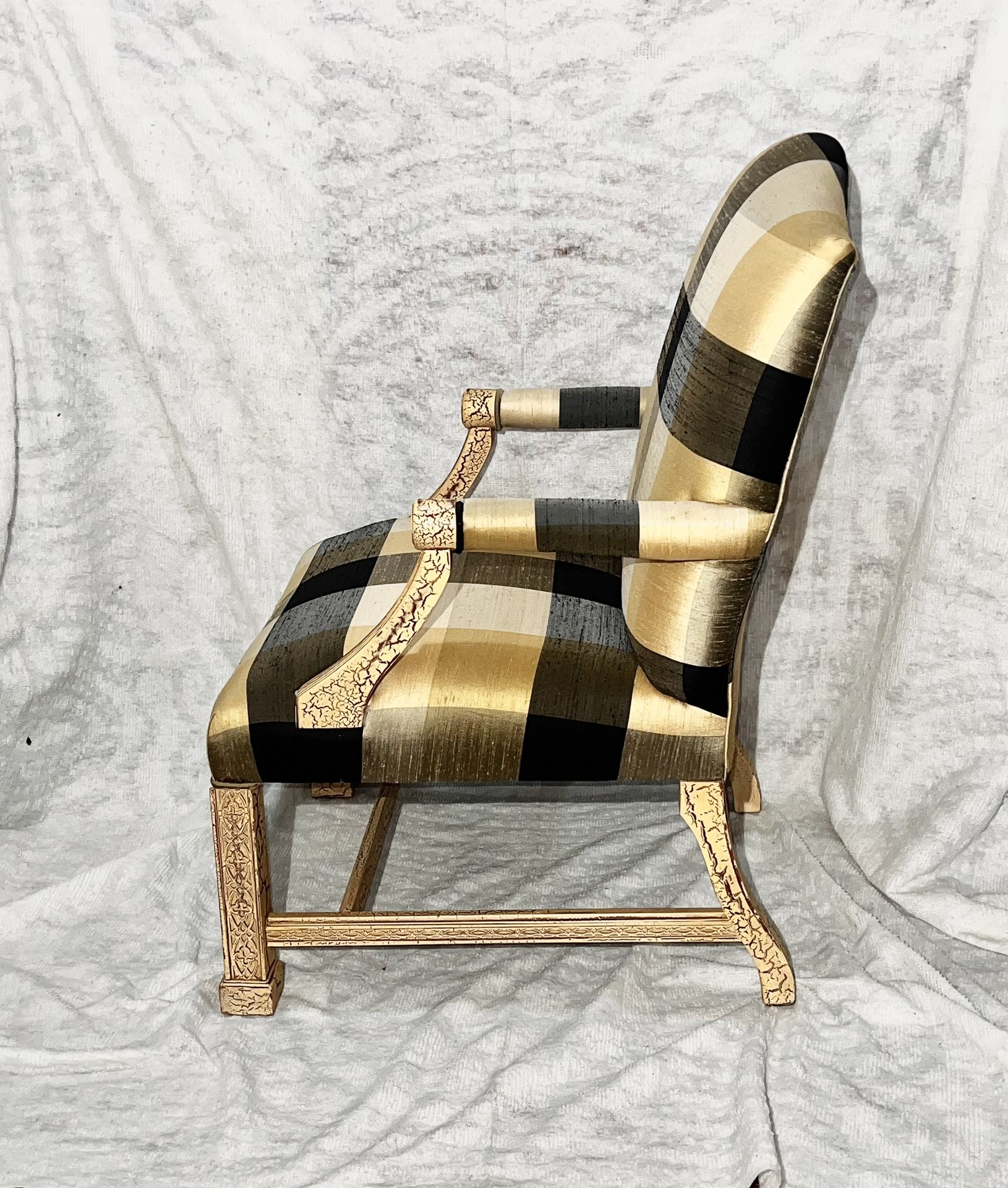 This chair is an upholstered armchair with a Chippendale-style mahogany frame, featuring a distinctive plaid silk blend fabric. Key Features Style: The frame is heavily influenced by Regency and Chippendale designs, characterized by its formal structure and ornate wood carvings. Material: It features a mahogany frame with a silk-blend upholstery. Design Elements: Upholstery: Bold, oversized plaid pattern in shades of gold, black, and cream. Frame Details: Intricate lattice-work or floral carvings on the legs and armrests, finished with a distressed or parcel-gilt effect. $50