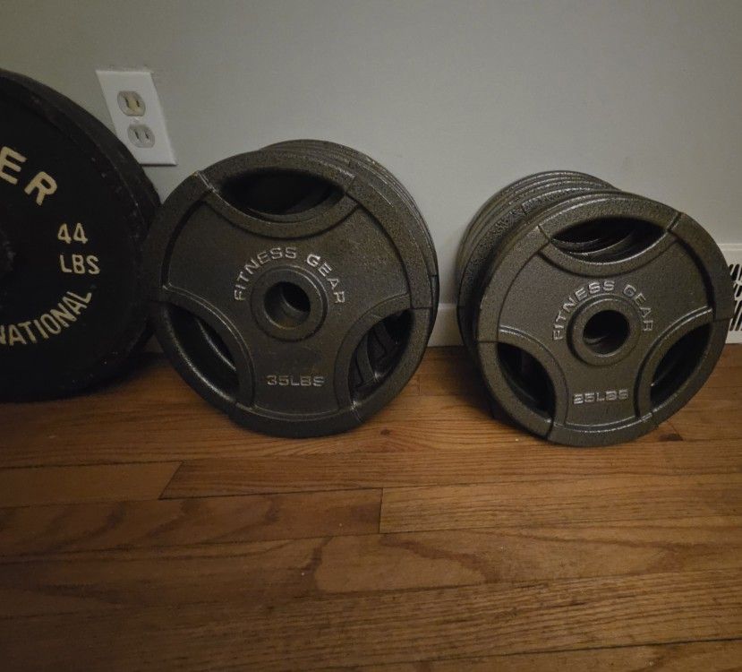 Olympic Bars 2- 44lb Weights 4- 35lb Weights 6- 25lb Weights Also includes: 2- 10lb Weights- 1" 2- 5lb Weights- 1" 2- Sets of 1" Bar Fastners 1- Weighted Vest 2- Ankle Weights Excellent Condition!!! Check my ratings! I'm off 96 and Telegraph.