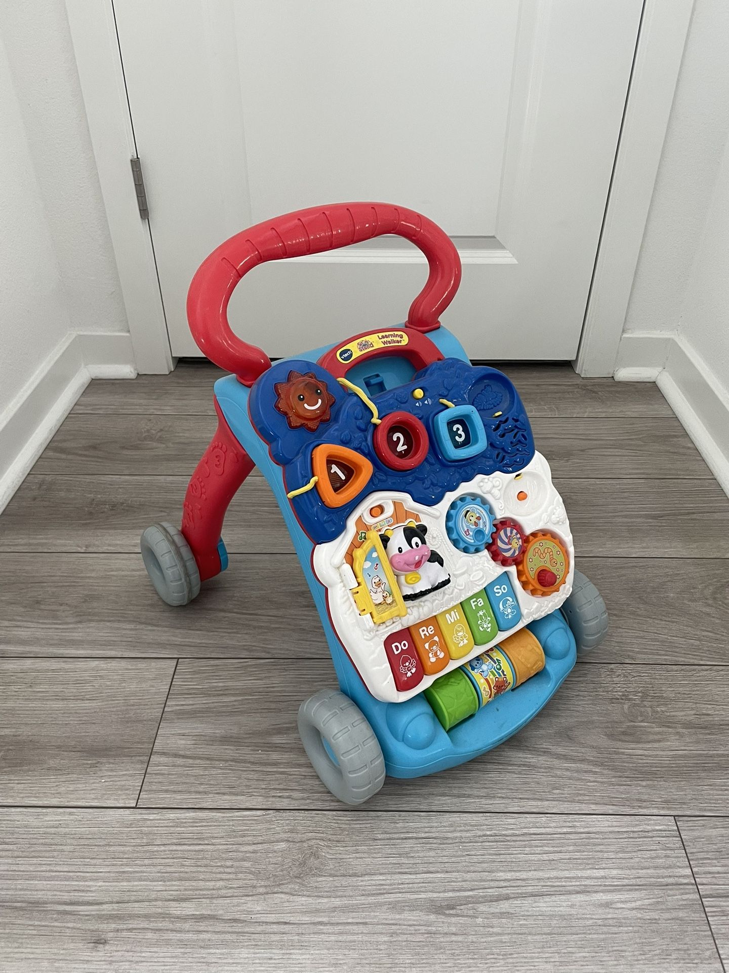 VTech Sit-to-Stand Learning Walker. This popular baby product is designed to help infants transition from crawling to walking through a combination of a sturdy walker and an interactive activity panel. Here's more information about it: 2-in-1 Design: It functions both as a floor-play activity center with a detachable panel and as a walker to encourage first steps and mobility. Interactive Features: The activity panel includes features like five light-up piano keys for music and number introduction, shape sorters with animal sounds, spinning gears, colorful rollers, and a removable toy telephone for role-play fun. Developmental Benefits: It aids in motor skill development, balance, hand-eye coordination, and introduces concepts like colors, shapes, numbers, and music. Adjustable and Portable: The walker has a two-speed control switch to accommodate different walking stages and features foldable legs for easy storage and portability. Age Range: It is intended for babies and toddlers generally aged 9-36 months.