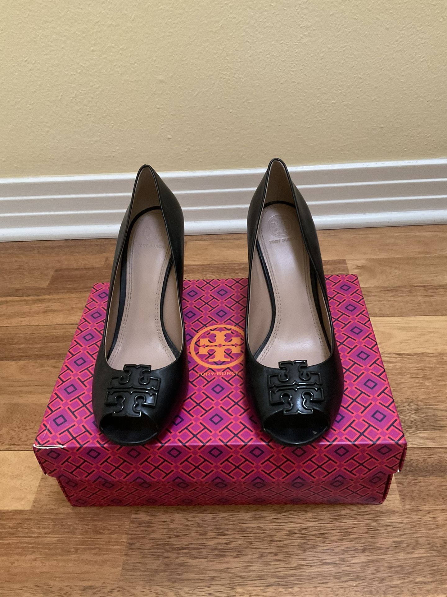Tory Burch Leather Wedges Size: 9.5 Color: Black leather with black heel with black logo Heel height: 3.5in Condition: lightly used Perfect for spring office wear or casual nights. Easy to match various outfits. Additional detailed photos upon request.  Available for local pick up for shipping.
