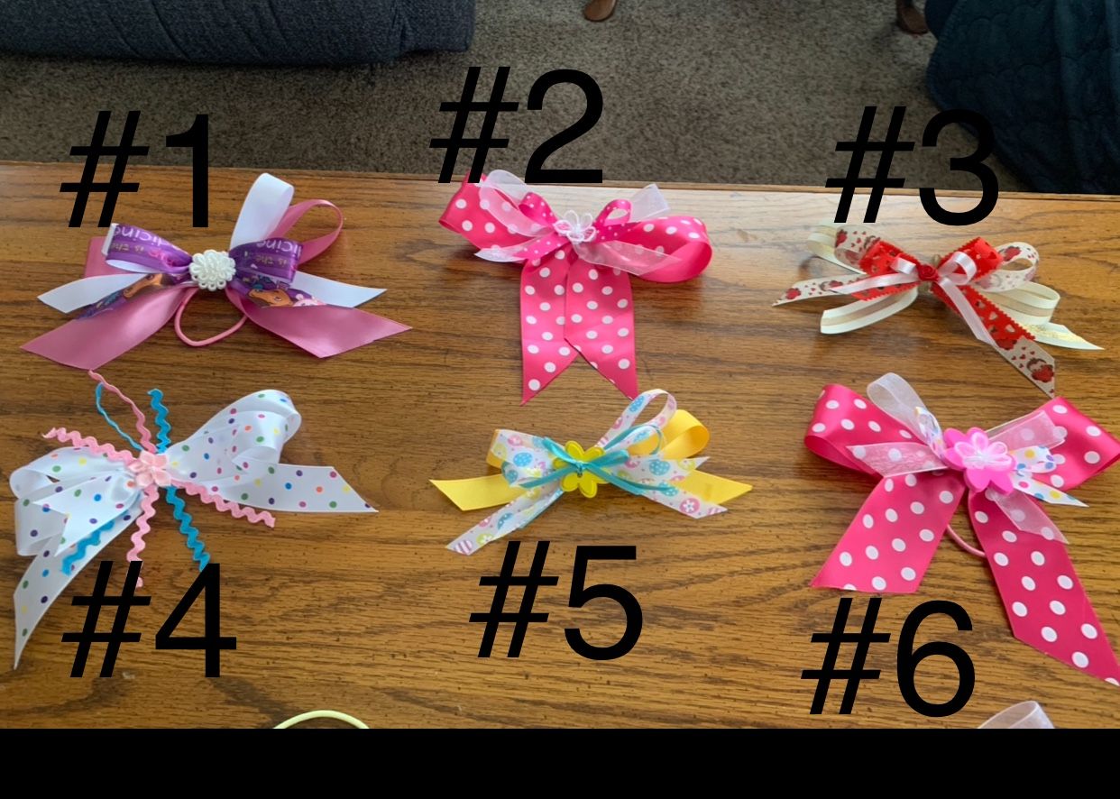 Cute hair bows some on ponytail holders some are on hair clips.