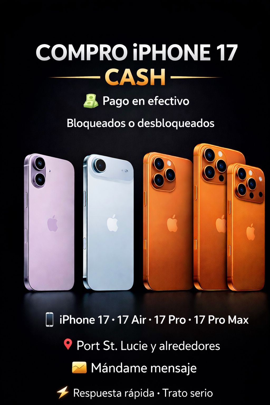 💵 COMPRO iPHONE 17 – CASH 📍 Port St. Lucie y alrededores Compro iPhone 17, 17 Air, 17 Pro y 17 Pro Max También iPad / tablets Apple ✅ Pago en efectivo ✅ Pago inmediato ✅ Bloqueados o desbloqueados 📩 Mándame mensaje con: ✔️ Modelo ✔️ Capacidad ✔️ Condición ✔️ Fotos ⚡ Respuesta rápida y trato serio