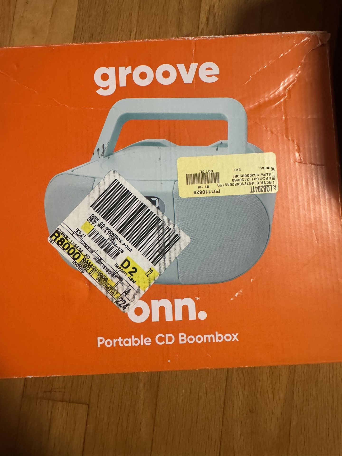 Enjoy your favorite CDs or radio stations anywhere with this stylish and portable Onn. Groove CD Boombox. Features a lightweight design with a built-in handle for easy carrying, making it perfect for home, travel, or outdoor gatherings. Features: • Plays CDs and CD-R/RW discs • Built-in FM radio • Portable with carry handle • Compact and lightweight • Color: Aqua • Model: Groove Portable CD Boombox