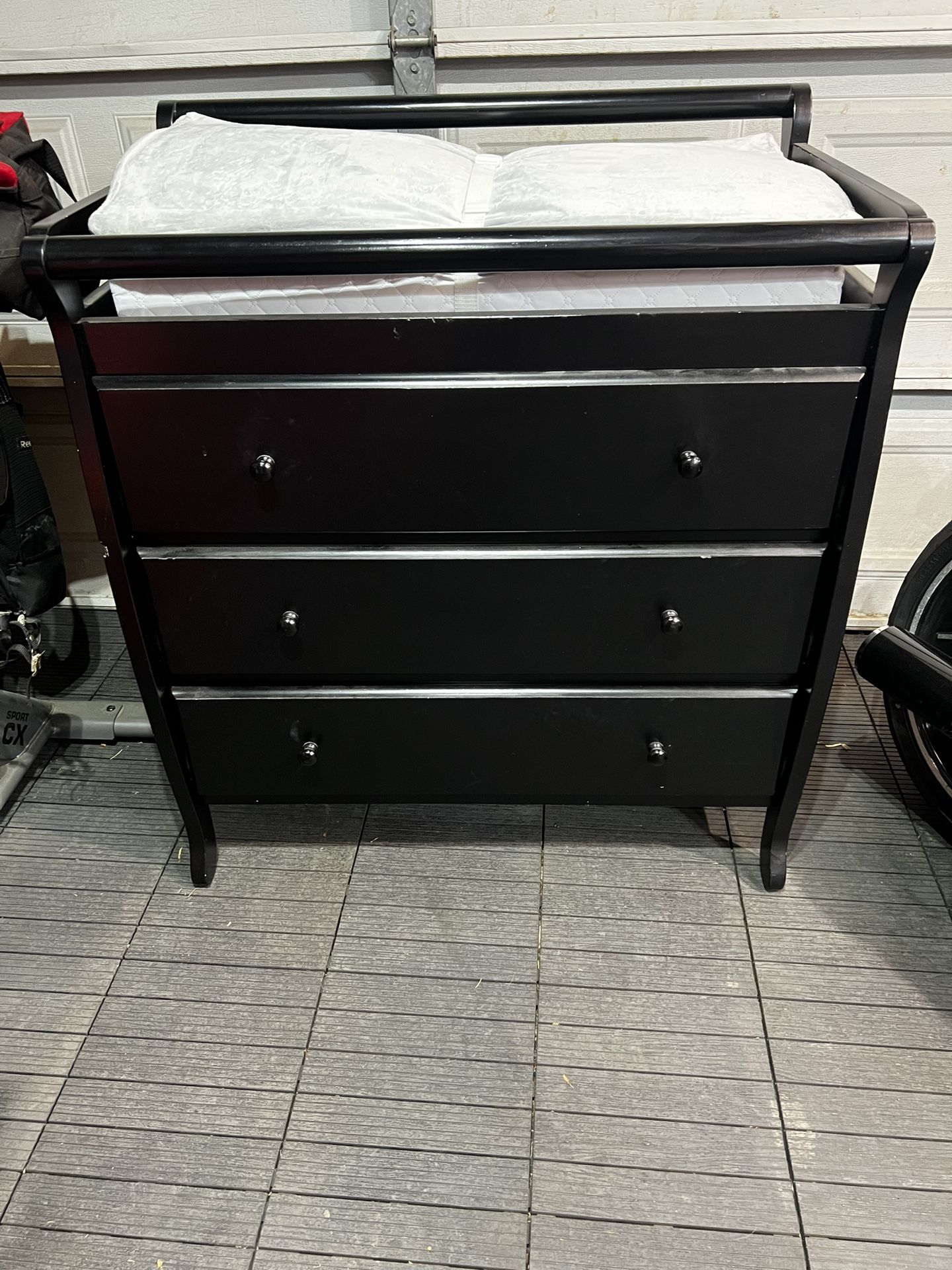Black changing table with sides so babies can’t roll off, has a strap to hold baby while changing. All 3 drawers slide in and out easily. Outside face of drawers is black and inside is white. Comes with changing table pad and pad cover. 21in wide x 38.5in high x 3ft long