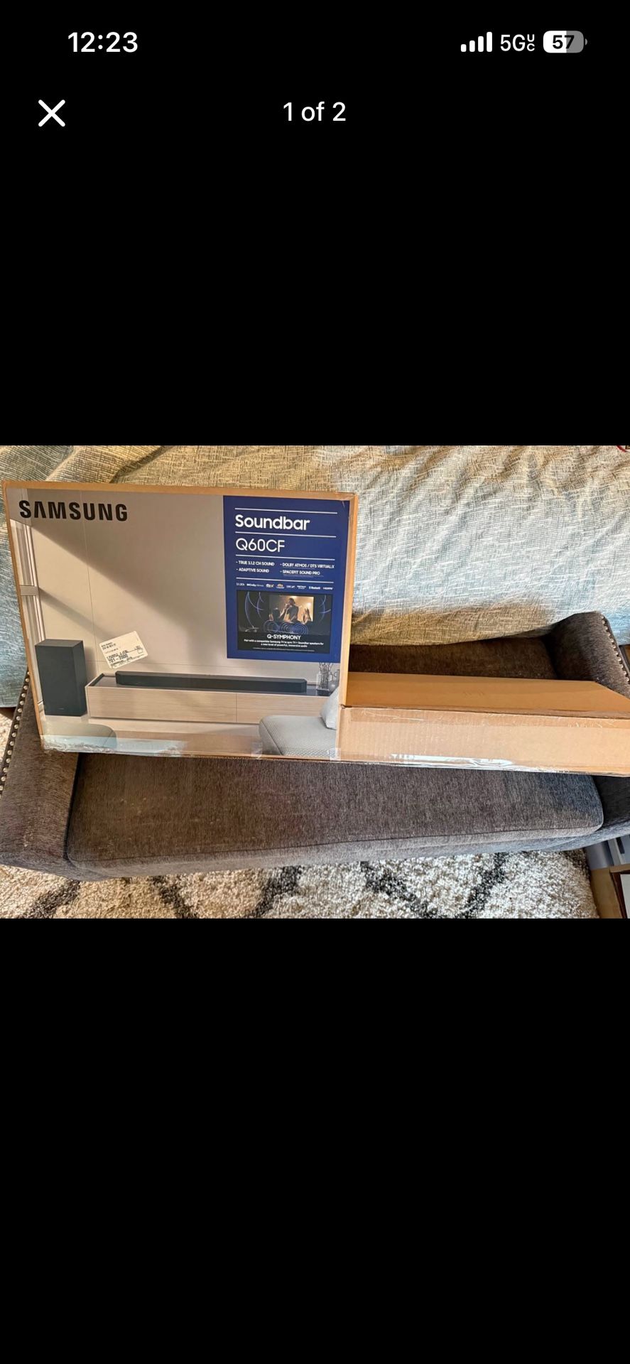 Premium Samsung Q60CF soundbar system with wireless subwoofer, delivering immersive Dolby Atmos / DTS Virtual:X sound and powerful bass in a sleek, modern package. Excellent upgrade for any TV or home theater setup. What’s included: • Samsung Q60CF soundbar • Wireless subwoofer • Power cables • Original box Features: • True 3.1.2 channel sound • Dolby Atmos & DTS Virtual:X immersive audio • Q-Symphony (syncs with compatible Samsung TVs) • Adaptive Sound for clear dialogue • SpaceFit Sound auto room tuning • Wireless subwoofer with deep bass • Bluetooth streaming • HDMI ARC / eARC compatible • Clean, low-profile design Perfect for movies, sports, gaming, and streaming. Model: Samsung Q60CF Keywords: Samsung soundbar, Q60CF soundbar, Dolby Atmos soundbar, Samsung Q Symphony, soundbar with subwoofer, wireless subwoofer, home theater system, TV sound system, Bluetooth soundbar, DTS Virtual X