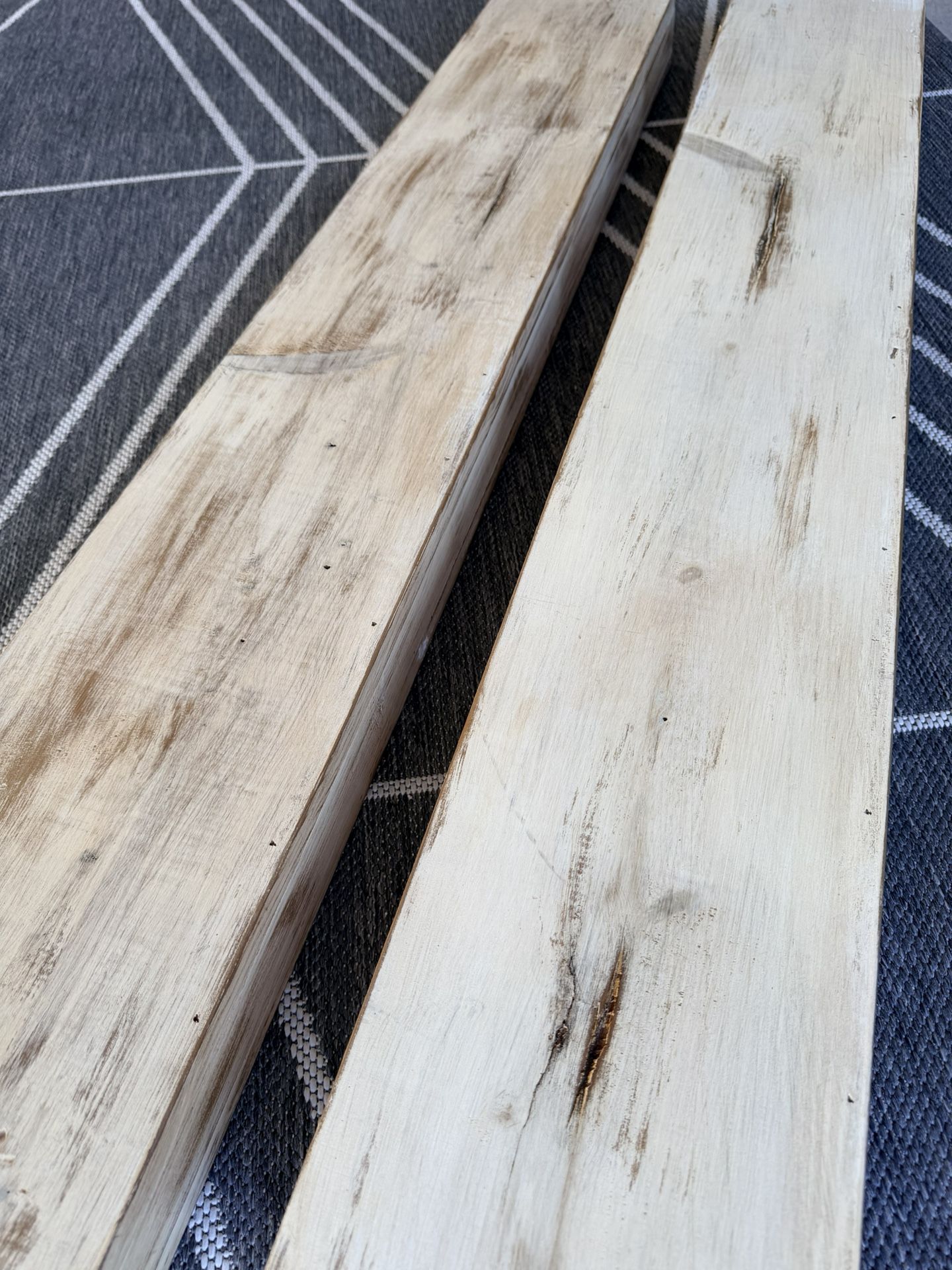 Features: * Off-white/ cream coloration * Distressed, rustic floating shelves * 3-inch thickness * Solidly constructed lumber * Wood includes decorative knots and imperfections * Not a solid beam; hollow core allows for mounting * Smooth surface finish * Mounts nearly anywhere using wall mollies/ stud system Overall dimensions of each shelf: 48 W x 3 H x 7.5 D