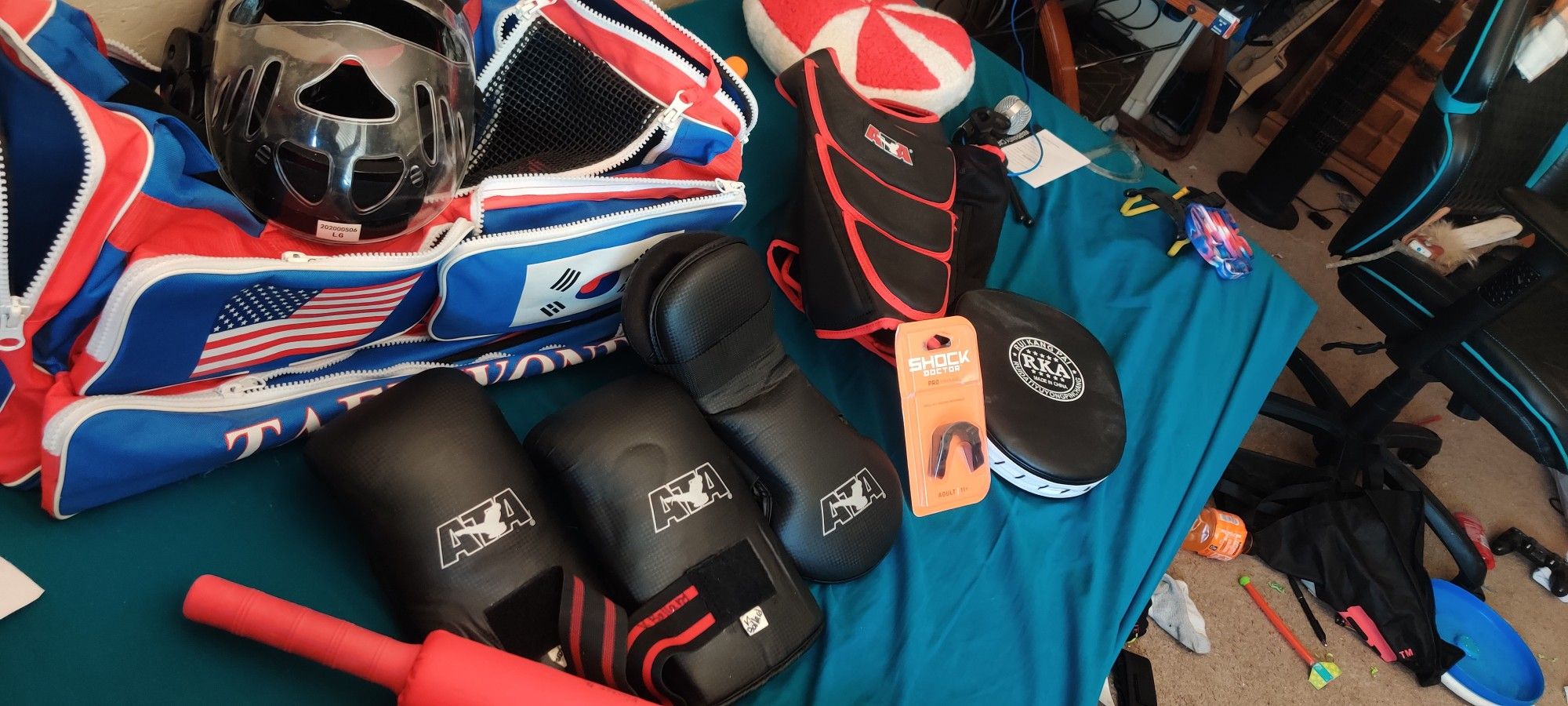 Used but in great condition. Adult large. $200 OBO bag in great condition, helmet with face guard, foot guards, chest and back vest guard, gloves, new in package mouth guard, padded baton, two practice punch pads one small one large. Plain white gi adult large.