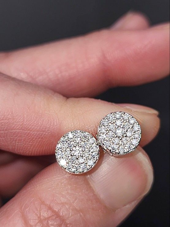 Base metal: Sterling Silver Main stone: VVS1(Flawless) Color D (Colorless) Moissanite. Every stone on these earrings is Moissanite. 0.6 Carats per earring. 1.2 Carats in total. *18kt White Gold Plated for extra shine and protection.* Round shape screwback stud earrings measuring 8mm in width. New with box. Passes diamond tester.