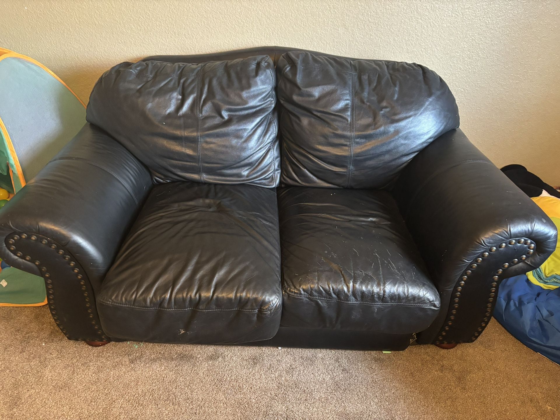 Two black genuine leather couches in fair condition. Set- $225 Sell individual- small couch $80 Large-$180 OBO 75th Ave and Union Hills