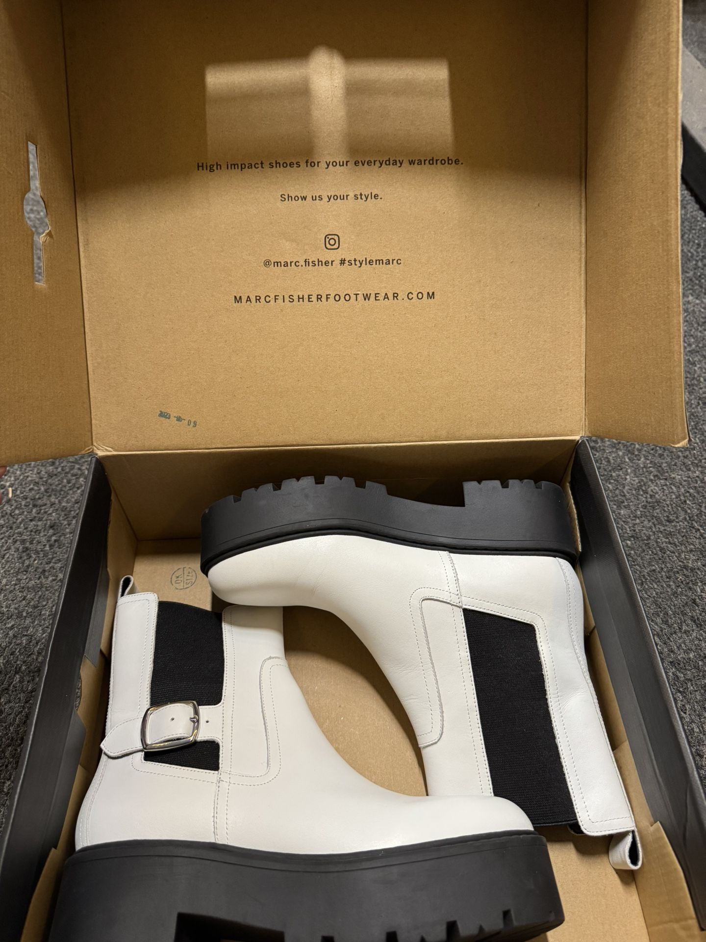 NIB Marc Fisher LTD Dacilla White Leather Platform Chelsea Boots - Size 7 Make a bold statement with these brand new in box (NIB) Dacilla platform booties from Marc Fisher LTD! This stunning pair is a women's size 7 M and comes in a chic white leather with a contrasting black platform sole. These high-impact boots feature a classic Chelsea boot silhouette with elastic side gores for an easy pull-on fit, updated with a chunky lug-sole platform. A stylish buckle strap detail adds a touch of moto edge. Perfect for elevating your everyday wardrobe, from jeans to dresses. Brand: Marc Fisher LTD Style Name: Dacilla Platform Bootie Size: 7 M Color: White Leather / Black Sole (WHITE 140) Condition: New In Box (NIB) Features: Genuine leather upper, chunky platform lug sole, elastic Chelsea-style gores, decorative buckle detail, pull tab at back. (Item #10065615) Home Environment: Comes from a smoke-free home. Cash Only, Local Pickup