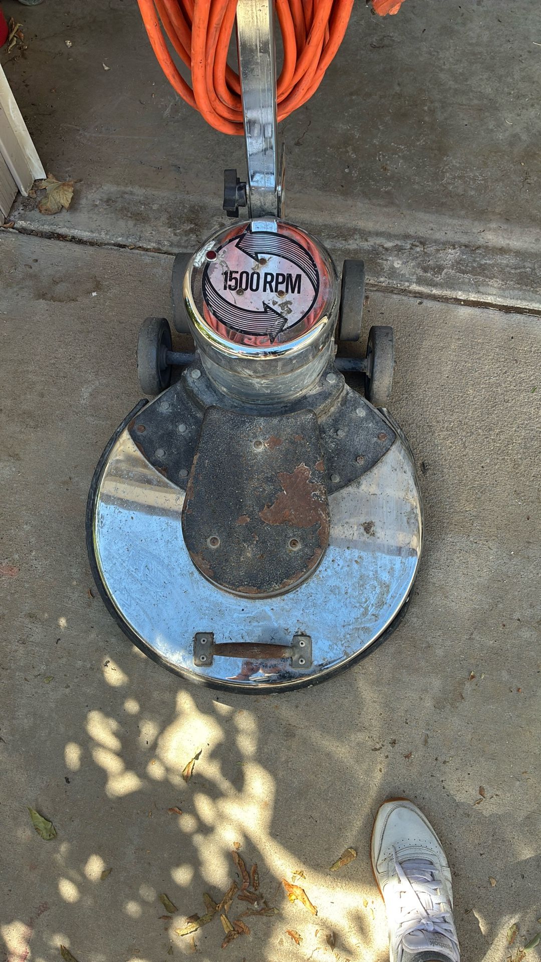 Thoro-Matic 1500 RPM floor burnisher (sometimes called a high-speed floor polisher). 🔹 What it’s for: • Designed for high-speed polishing/burnishing of floors that already have floor finish (wax). • It doesn’t scrub or strip — its main job is to create a wet-look shine. • Best used on vinyl tile, terrazzo, or similar hard floors in schools, offices, and stores. 🔹 Specs (typical Thoro-Matic 1500 models): • 1500 RPM pad speed • 20” pad size (sometimes 17”) • 1–1.5 HP motor • Heavy steel/aluminum frame with big wheels • Push-handle style with safety switch 🔹 Value & parts today: • Used machines usually sell between $200–$600 depending on condition.