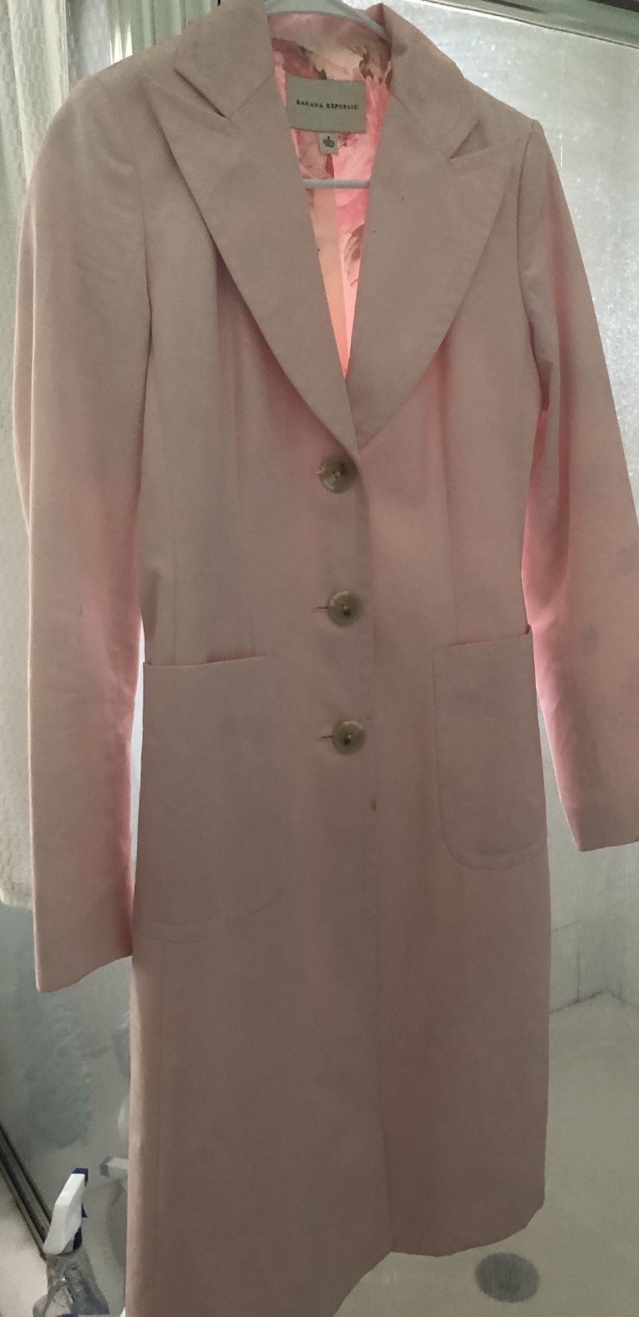 Beautiful light wear pink trench coat with floral lining. Size small. In perfect condition.. fun piece to add to your wardrobe !