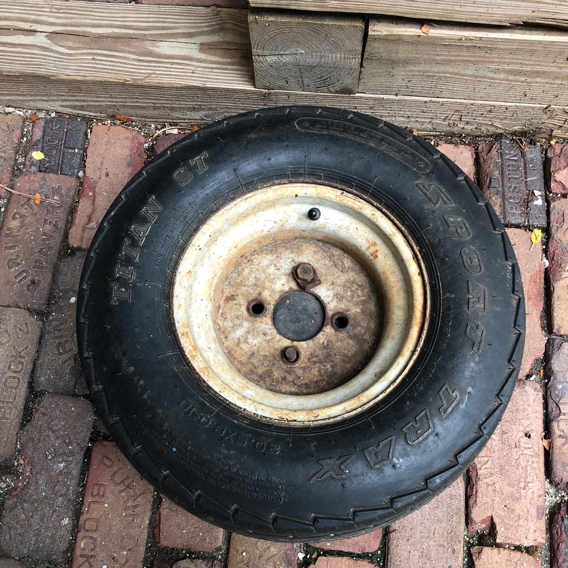 Titan sport tractor size 20.5x8.0. 4 ply sidewall and 4 ply tread. Has mounting bracket and bolts still available on
