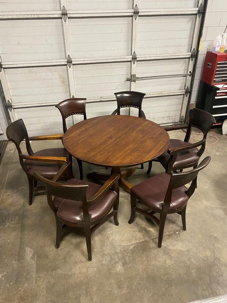 The Dinning table has a small crack on the end of it, but I've used this table for many years with it :) Dining table: Diameter 45.5 Diameter Cover 54in Height 30in $75.00 Chairs (6) height 36in Height arms to legs 26in $100.00