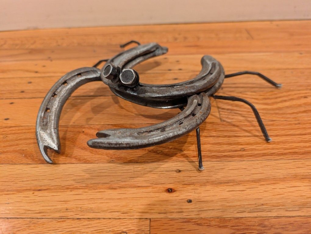 This sculpture has been crafted from repurposed horseshoes and metal scraps. It features a crab design using two horseshoes for the body and smaller metal pieces for the legs and eyes. It can be used outdoors or indoor (this has always been indoor). 10” wide x 9” deep x 3” tall Excellent condition. Located in Carmel, CA.