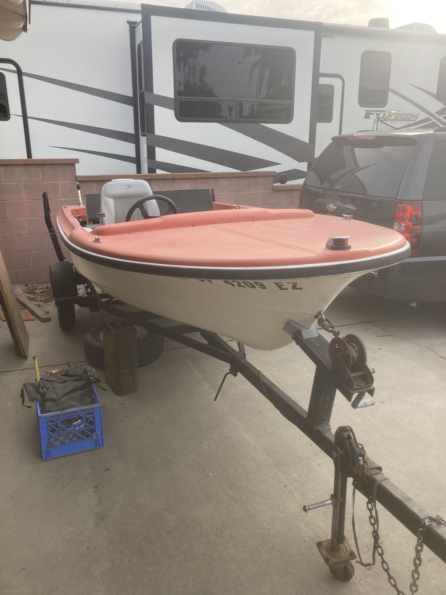 This is a 14 foot boat with a 35hp sea king(Chrysler) outboard, starts right up, runs, has gas tank, battery, spare tire, and a deck light. Can use a newer passenger seat, and I build the bench seat i can pull it out if you don’t want it. Ready to run!