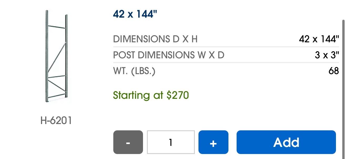 Pallet Rack Additional Uprights - 42 X 144" - Brand new never used purchased as extra Qty 1 - $150