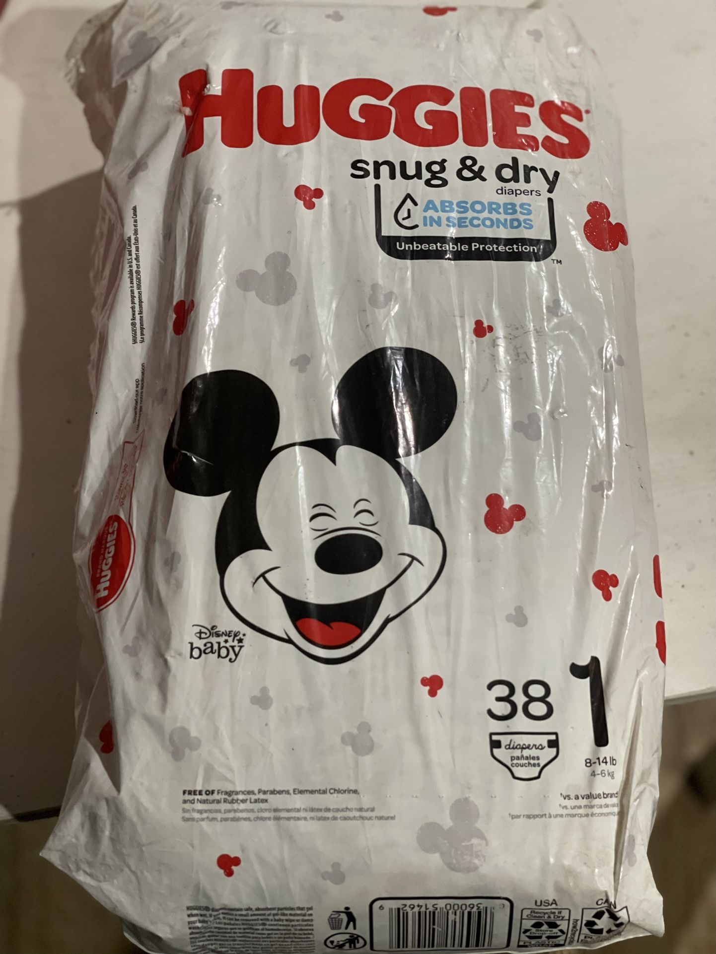 Pack of Huggies snug and dry diapers size 1..pack has 38 ct