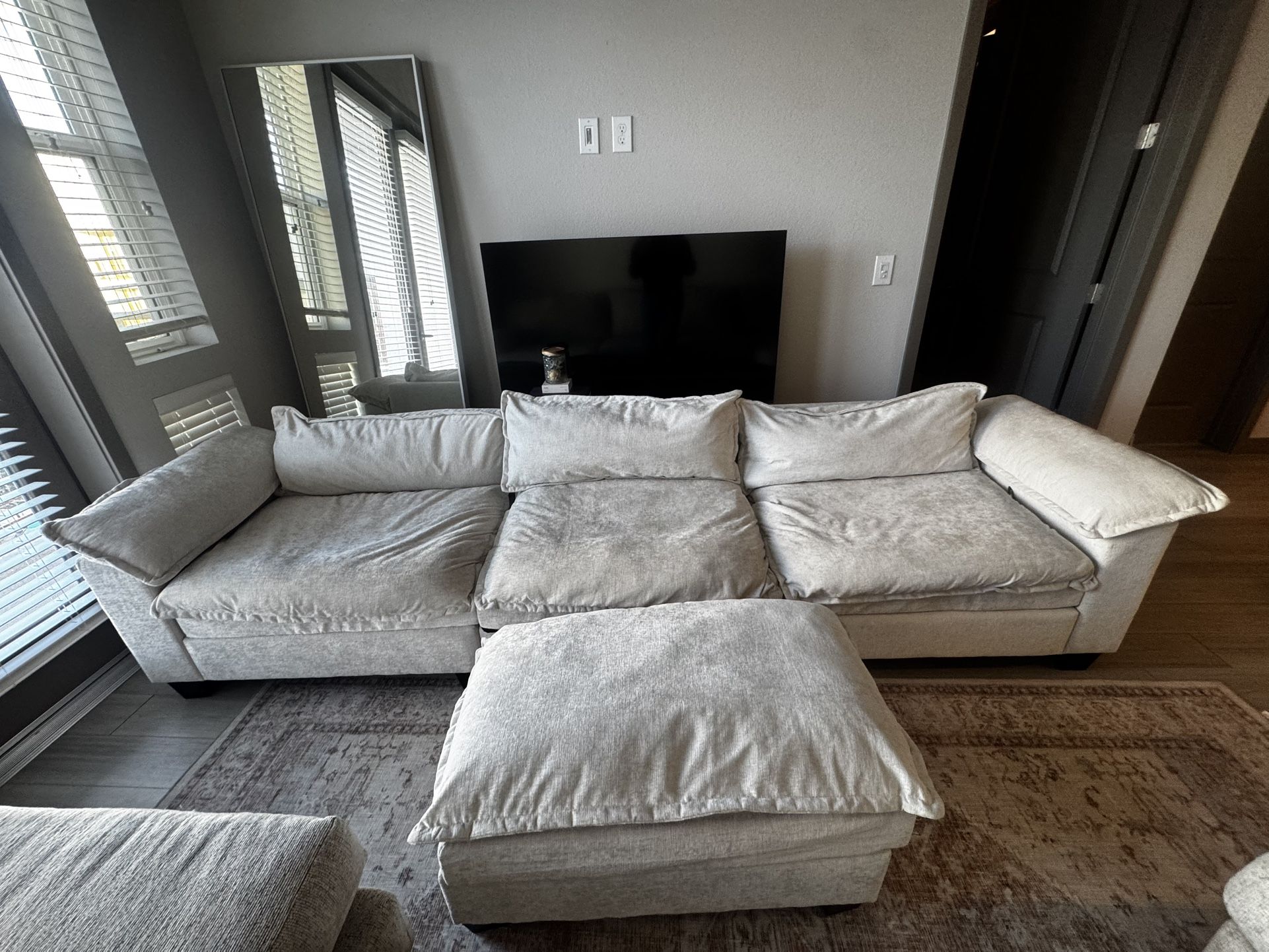 Cream colored couch with Ottoman. Purchased off Amazon about 1 year ago. Smoke and pet free home. There is a stain on the middle section. Pick up only from downtown Phoenix