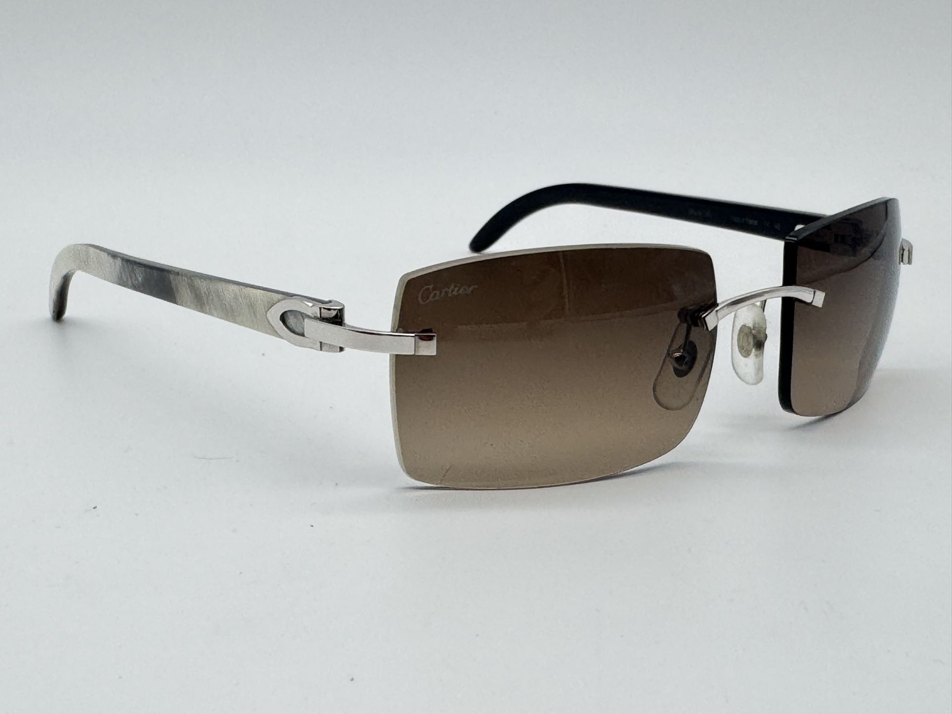 FOR SALE IS A NEW UNWORN 100% AUTHENTIC RARE CARTIER C DECOR PURE WHITE GENUINE BUFFALO HORN SUNGLASSES IN PLATINUM FINISH METAL AND BROWN GRADIENT LENSES.RETIAL PRICE IS $3900 FOR THIS MODEL.GLASSES COME WITH THE CARTIER OUTER BOX,RED BOX, CLEANING CLOTH, CLOTH CASE AND BOOKS OF AUTHENTICATION. THESE HAVE NEVER BEEN WORN BUT BEEN A DISPLAY AT CARTIER STORE FOR A FEW DAYS AMD AS YOU CAN SEE IN THE REAL PICTURES HORN AND METAL IS IN PERFECT MINT CONDITION. ONE OF THE LENSES HAVE A VERY TINY MINOR SCRATCH ON THE BOTTOM WHICH IS NOT VISIBLE UNLESS YOU LOOK CLOSELY AND WON'T AFFECT THE VIEW AT ALL. IT IS A VERY NICE COMBINATION OF PURE WHITE HORN WITH GRAY STRIPES AND BROWN GRADIENT LENSES.MODEL NUMBER FOR THIS PAIR IS CT0019RS 001 CAT 3.DIMENSIONS ARE 55-17-140.LENSES ARE 55 X 39MM.THESE ARE UNISEX SO BOTH MEN AND WOMEN CAN WEAR THEM.HURRY UP CARTIER LOVERS AND DON'T MISS THEM FOR THIS PRICE