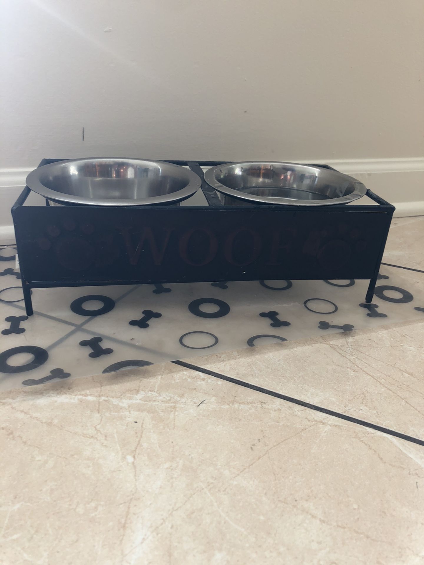 Metal says “WOOF” In front and is great for small to medium pet essentials