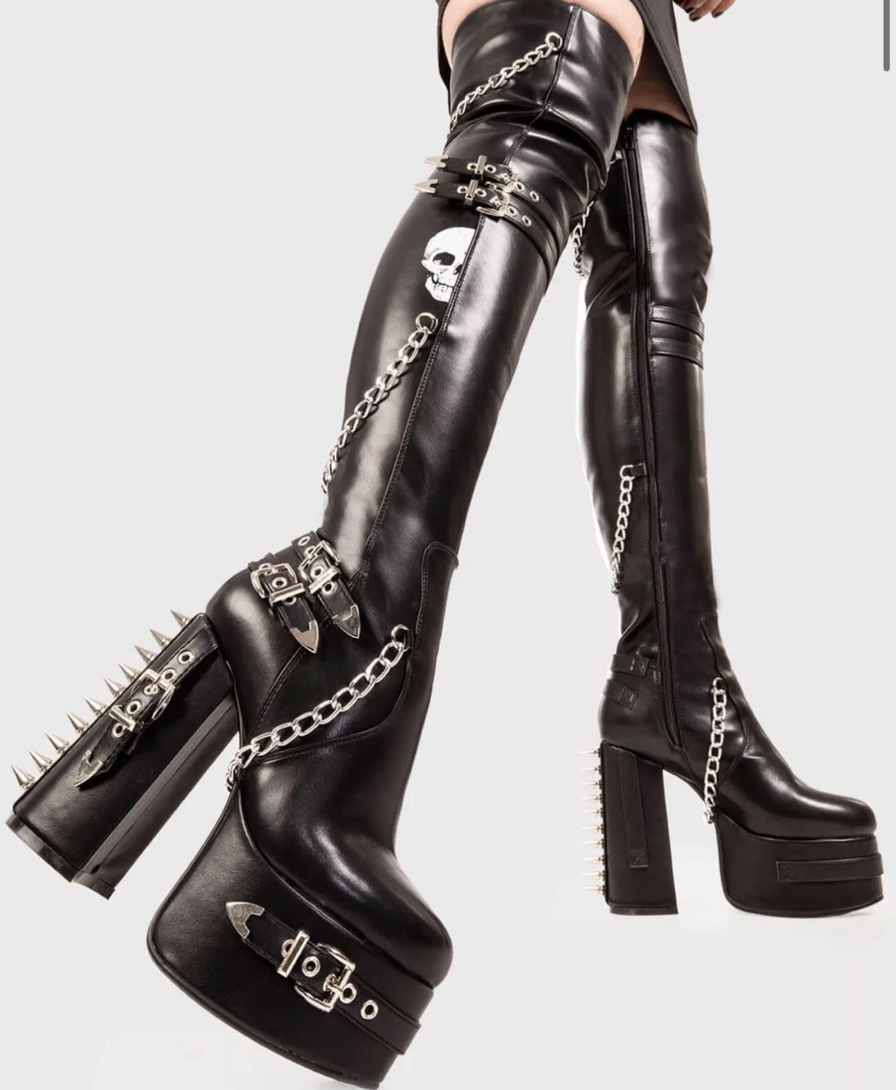 LaModa SCREAM PLATFORM THIGH HIGH BOOTS NEW NEVER WORN with box Platform Height: 2.5 inch - Heel Height: 5.5 inch - Thigh High length - Skull print - Silver spikes and chains - Buckles with silver eyelets - Black zipper - Platform sole - Round toe - 100% vegan Size Women’s 9 Narrow Fit Thigh High Final sale!! Please message me if you have any questions.