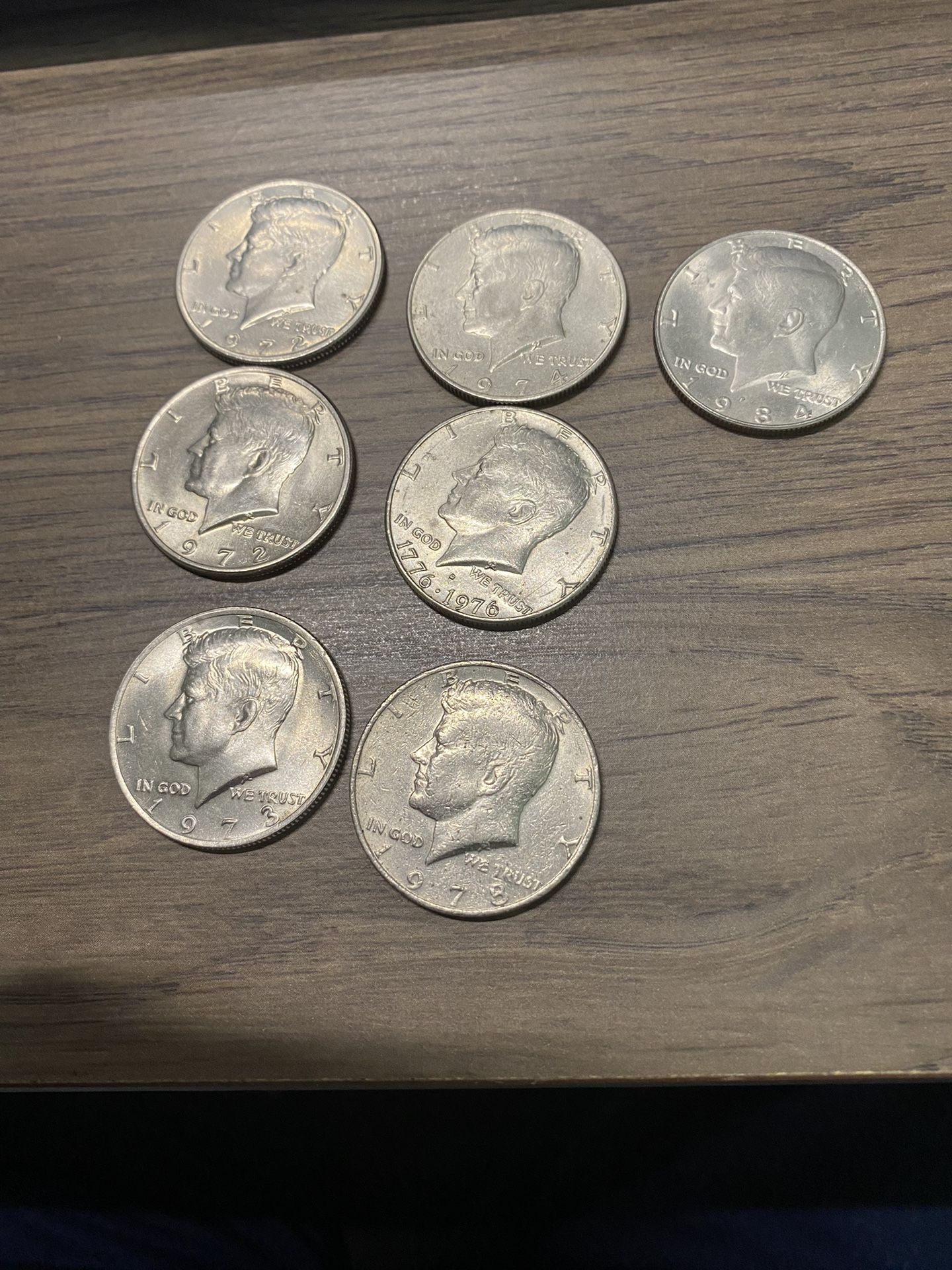 Seven Kennedy half dollar coins. Two 1972, one 1973, one 1974, one 1978, one 1984 and one bincentenial $ 20 each or all 7 for $ 130. Port St. Lucie cash only.