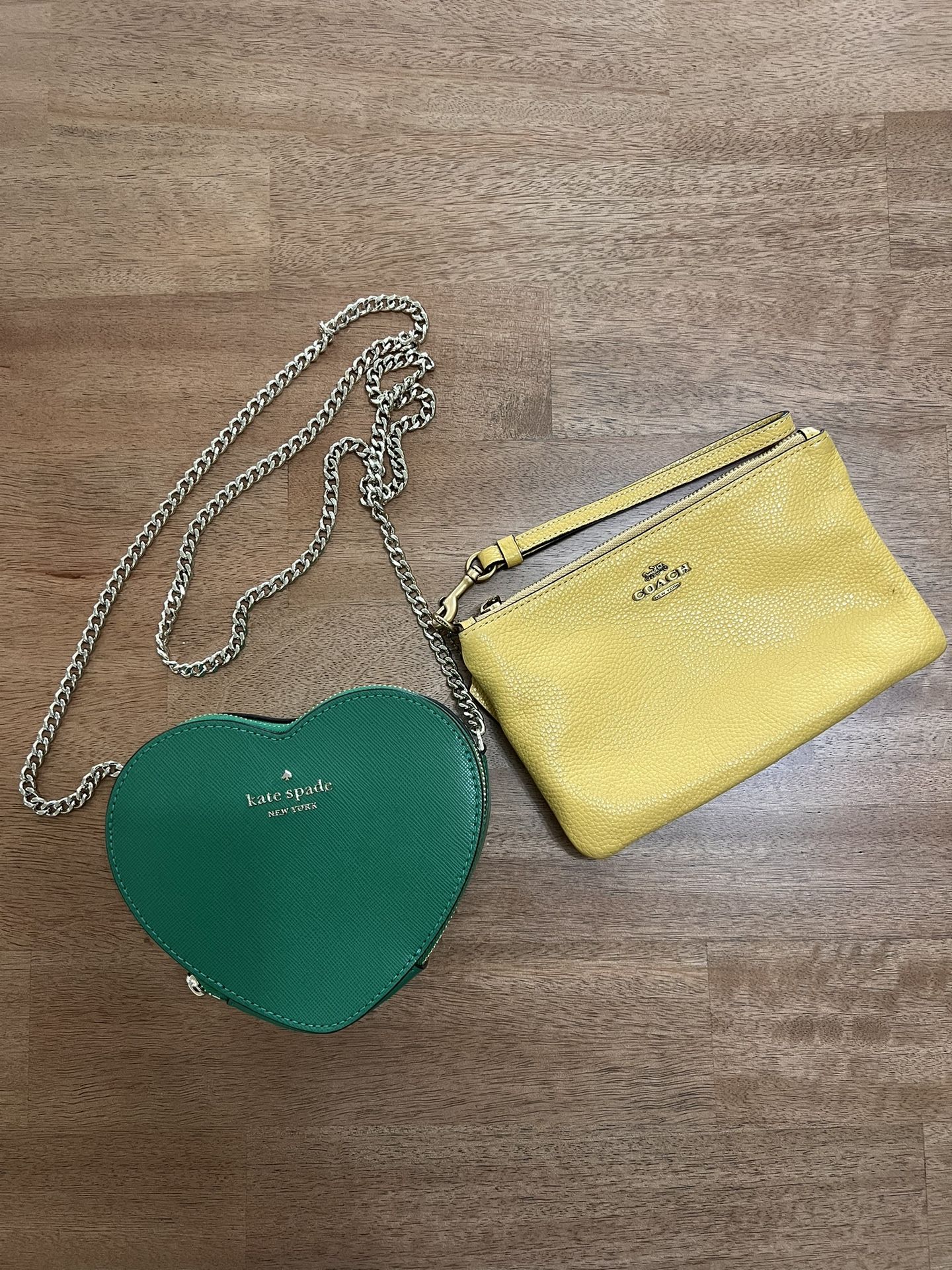 Kate Spade Heart Purse $20 ( about 6 inches wide, 5 inches tall) Coach clutch $15 ( about 8 inches long, 5 inches wide) Or both for $30 In good condition, perfect for holding a phone and small wallet when going out.