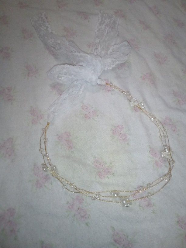 2 -Flower girls head piece white embellished, clear crystal like beads and pearls with white lace ribbon . Each $6.00 pickup, shipping is extra