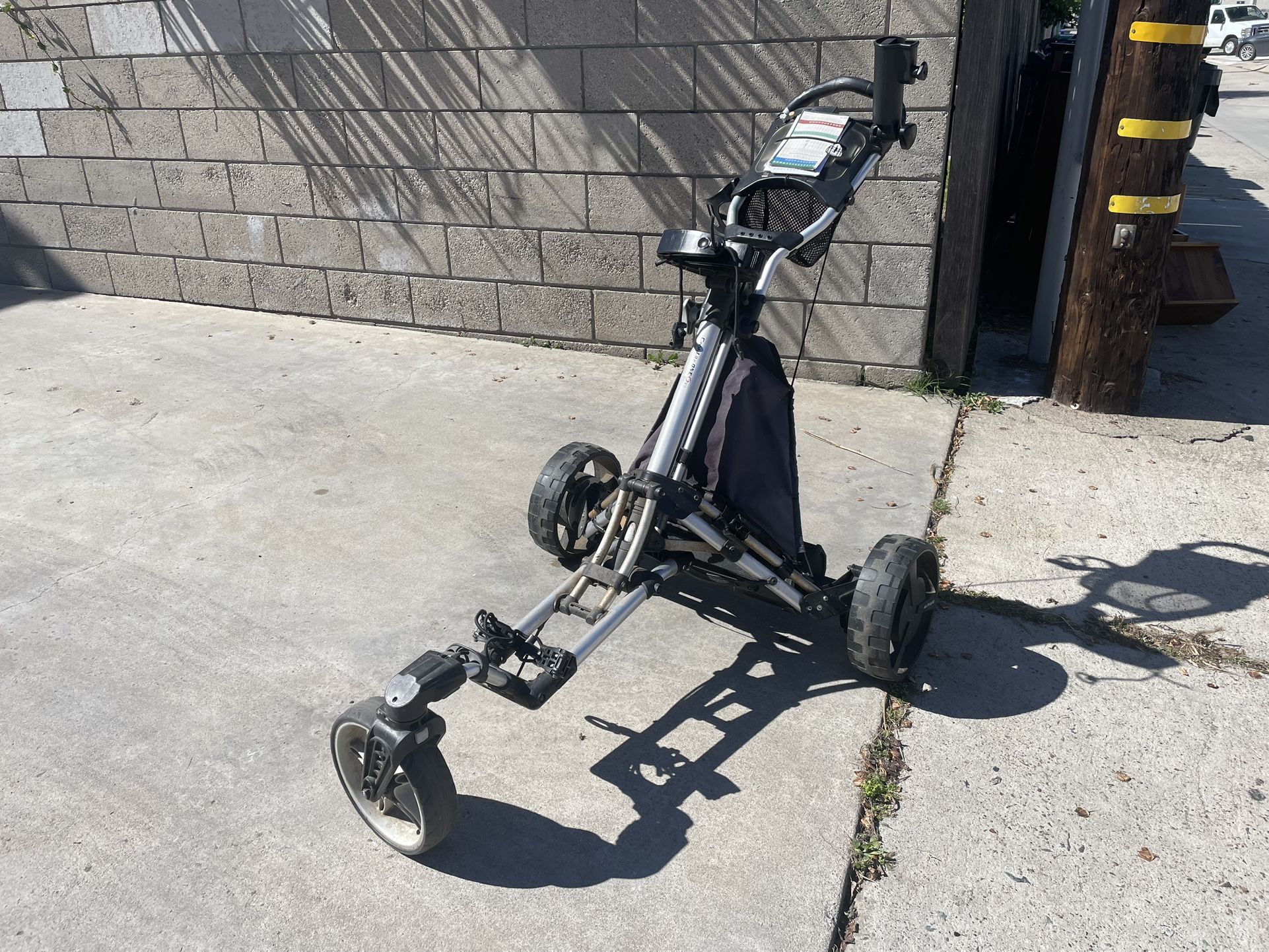 Caddytek front swivel wheel push cart with the SDPLOC adapter for the Alphard V2. Very quick to put and breakdown, probably 2 seconds of effort. No big tears in the push cart and cooler compartment is still in good condition. The battery is tired, it can do 9 holes at the 18 course at Balboa. It can do 18 holes on a very flat course with no rough. New battery is recommended for a full 18 at Torrey south when the rough is up. No trades, will not part out, FIRM on price