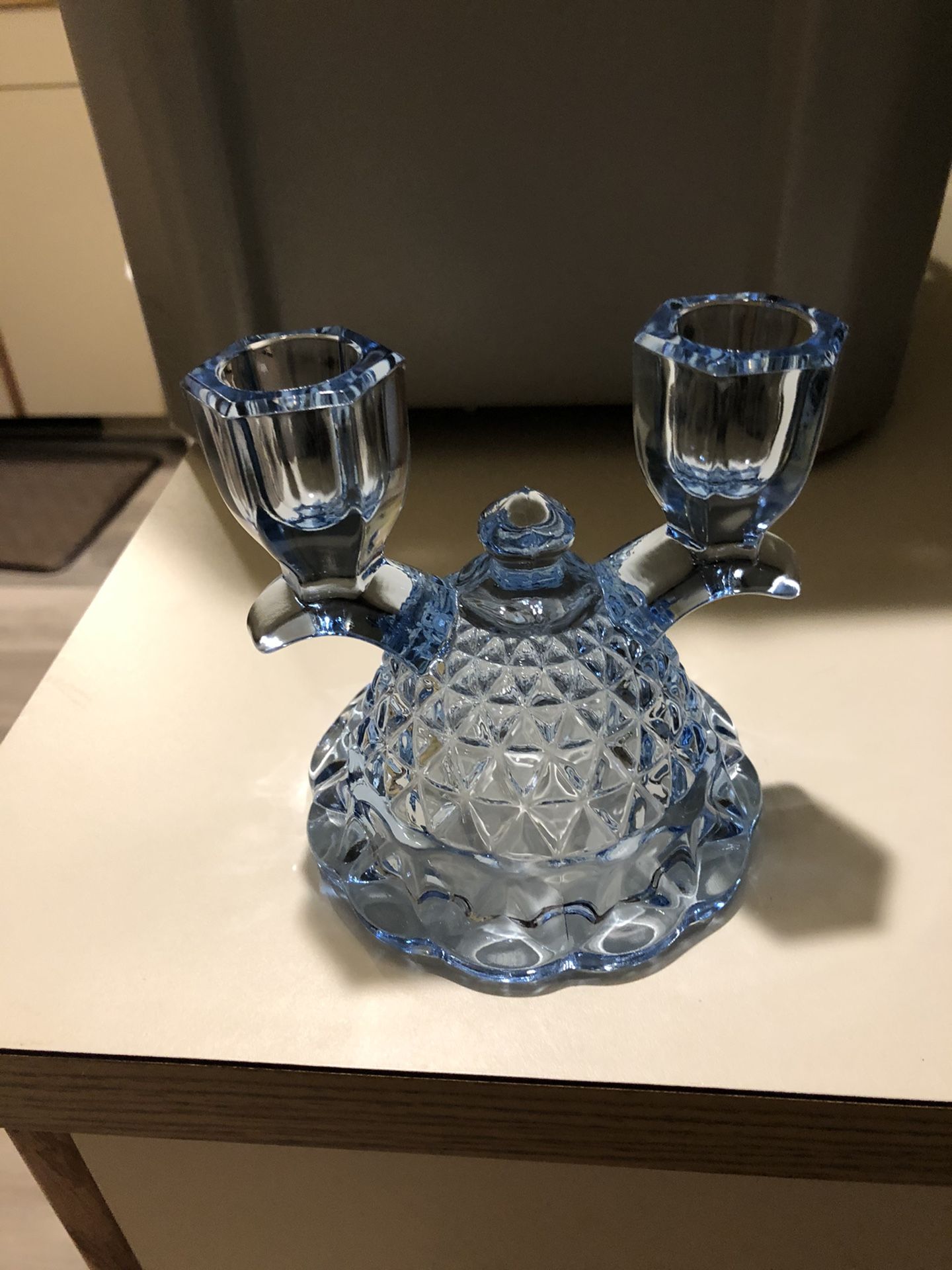 Lovely double candle holder. Light blue glass. Excellent condition Matching fruit bowl Also light blue glass. No chips or cracks