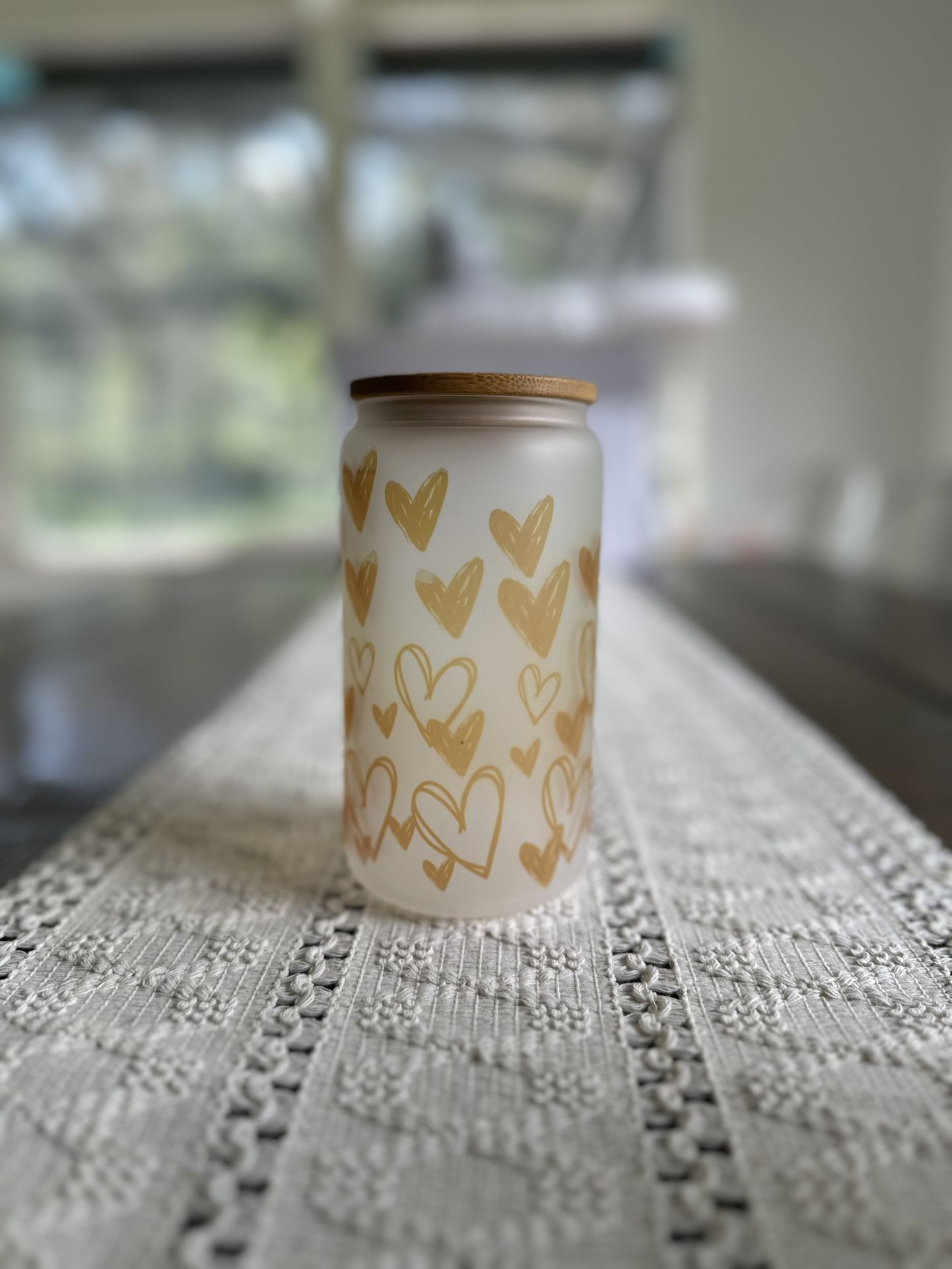 Glass tumblers 6oz Frosted glass Great for iced coffee Get your gifting done early this holiday season! Bamboo lid and reusable straw 6 inches tall See other posts for; Christmas/holidays Monstera leafs Hearts