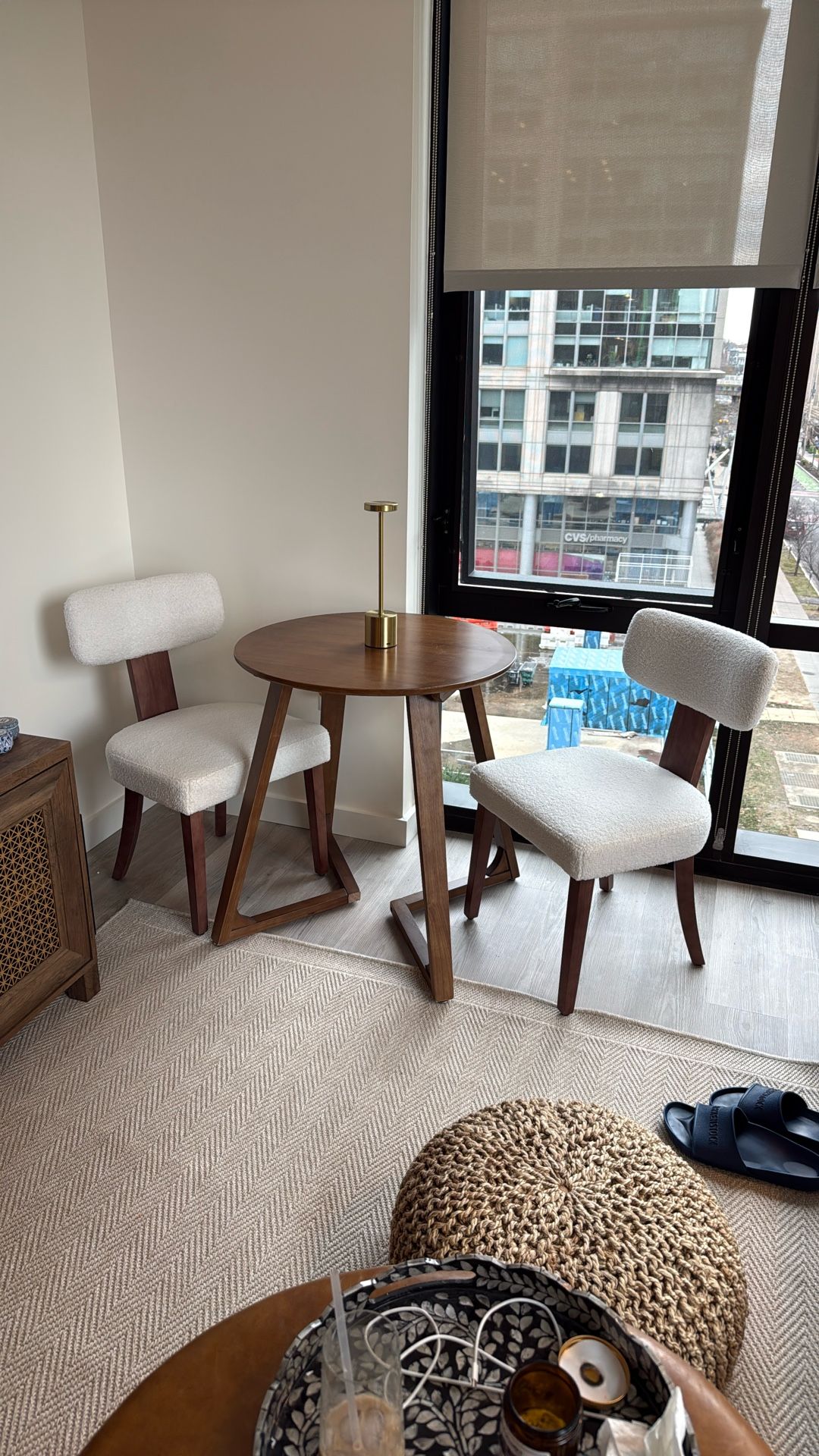 Year old walnut table and bouclé chair set. Very sturdy and stylish.