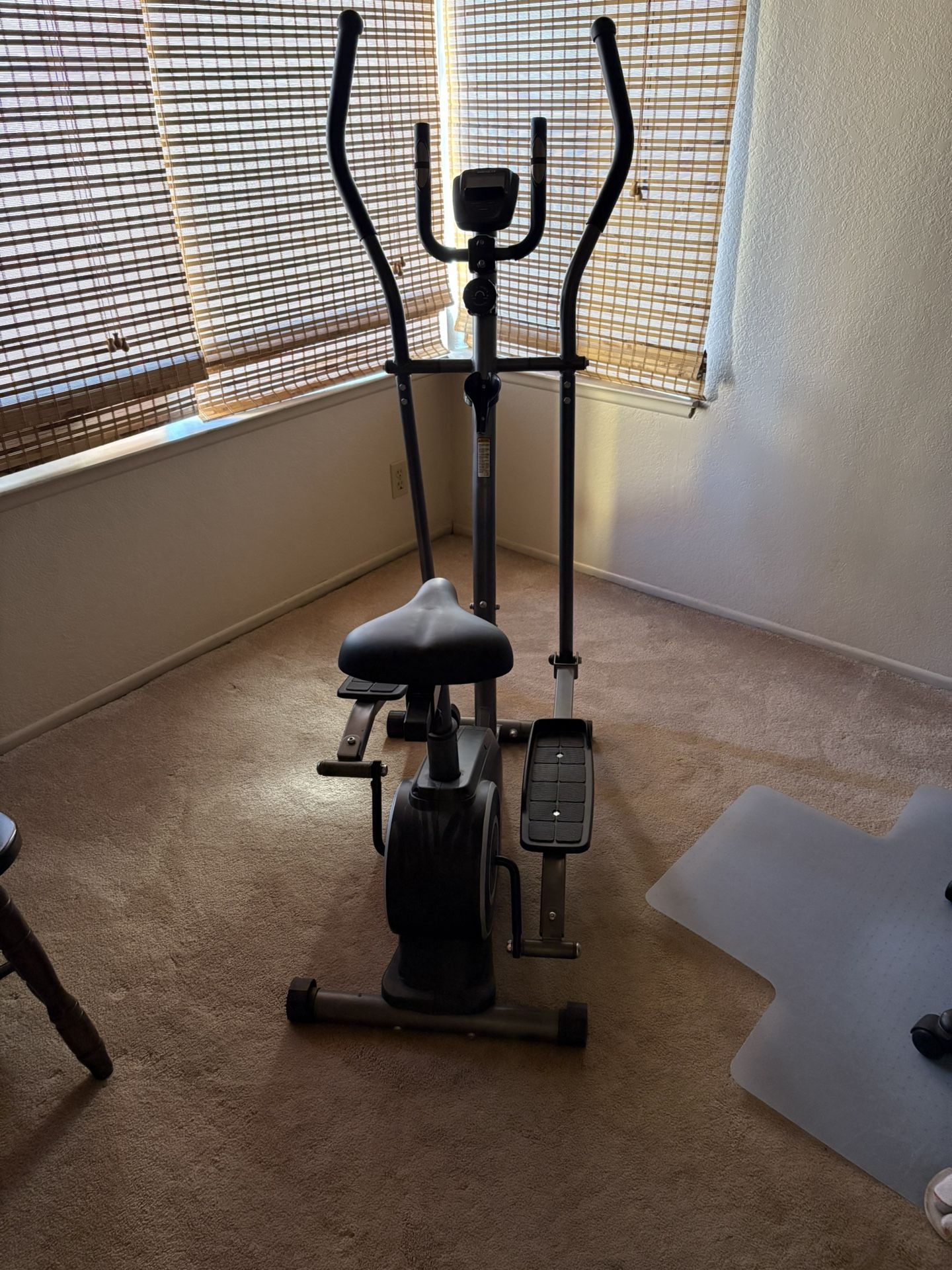 You can stand or sit to exercise. Adjustable tension control. The Weslo Momentum G 3.2 Bike and Elliptical Hybrid Trainer is a recumbent machine that can be used as both an exercise bike and an elliptical machine. It has an LCD window display and a weight capacity of 250 lbs. It also has an easy-turn knob to adjust resistance.
