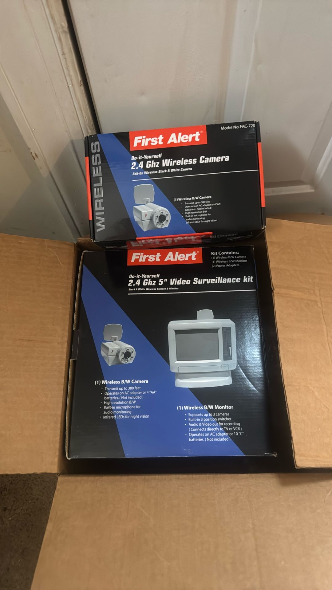 Includes additional 2.4 GHZ wireless camera. Brand new inbox Main box includes wireless black-and-white, monitor, and one wireless black-and-white camera Also includes second wireless camera. Two cameras total