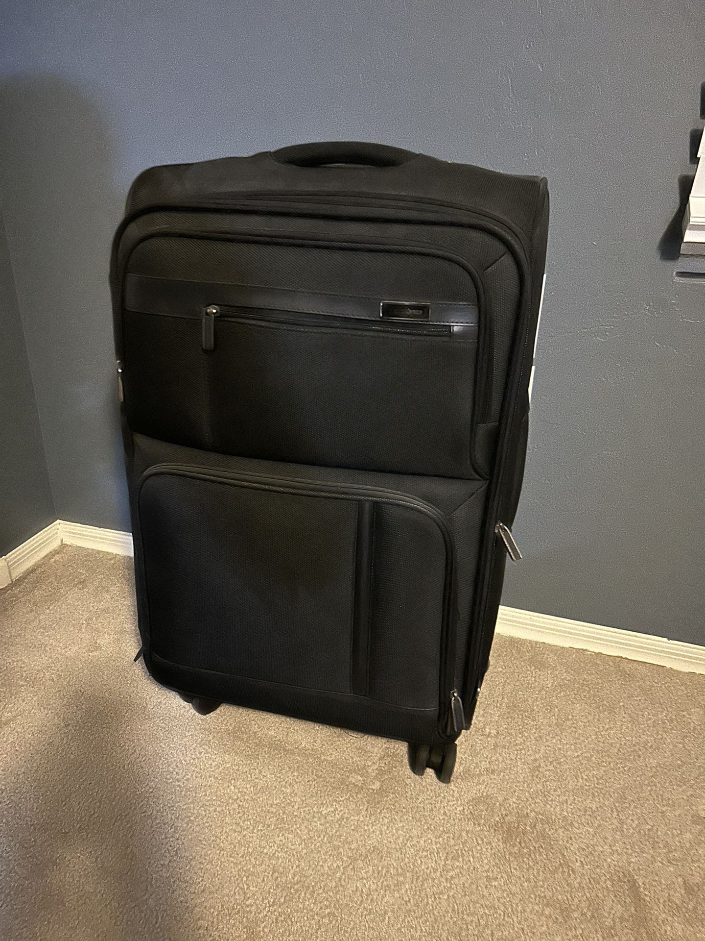 Black Samsonite rolling luggage. Dimensions are 10”x17”x25”. Used twice. In great condition.